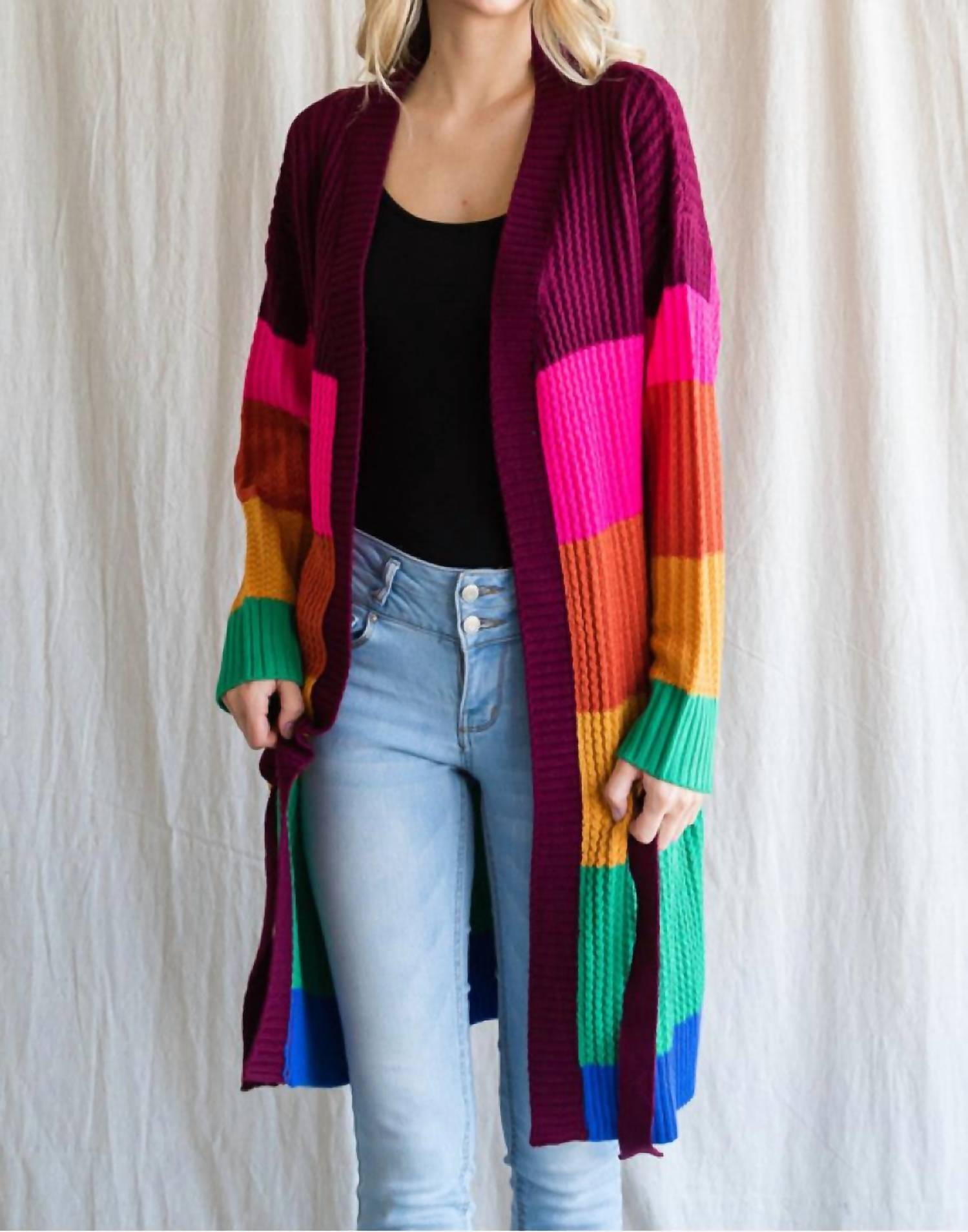 This cardigan will be a sweater-rotation favorite. Elevate your wardrobe with the Color Bomb Cardigan by Jodifl, a vibrant addition perfect for brightening any day or night. This colorful striped chunky knit cardigan features long sleeves and a belted waistline for a flattering fit. It comes with a convenient tie closure and is crafted to be non-sheer and lightweight. Care for this garment by hand washing and line drying, ensuring its bold Maximalist charm lasts. Ideal for women seeking a stylish vacation essential.