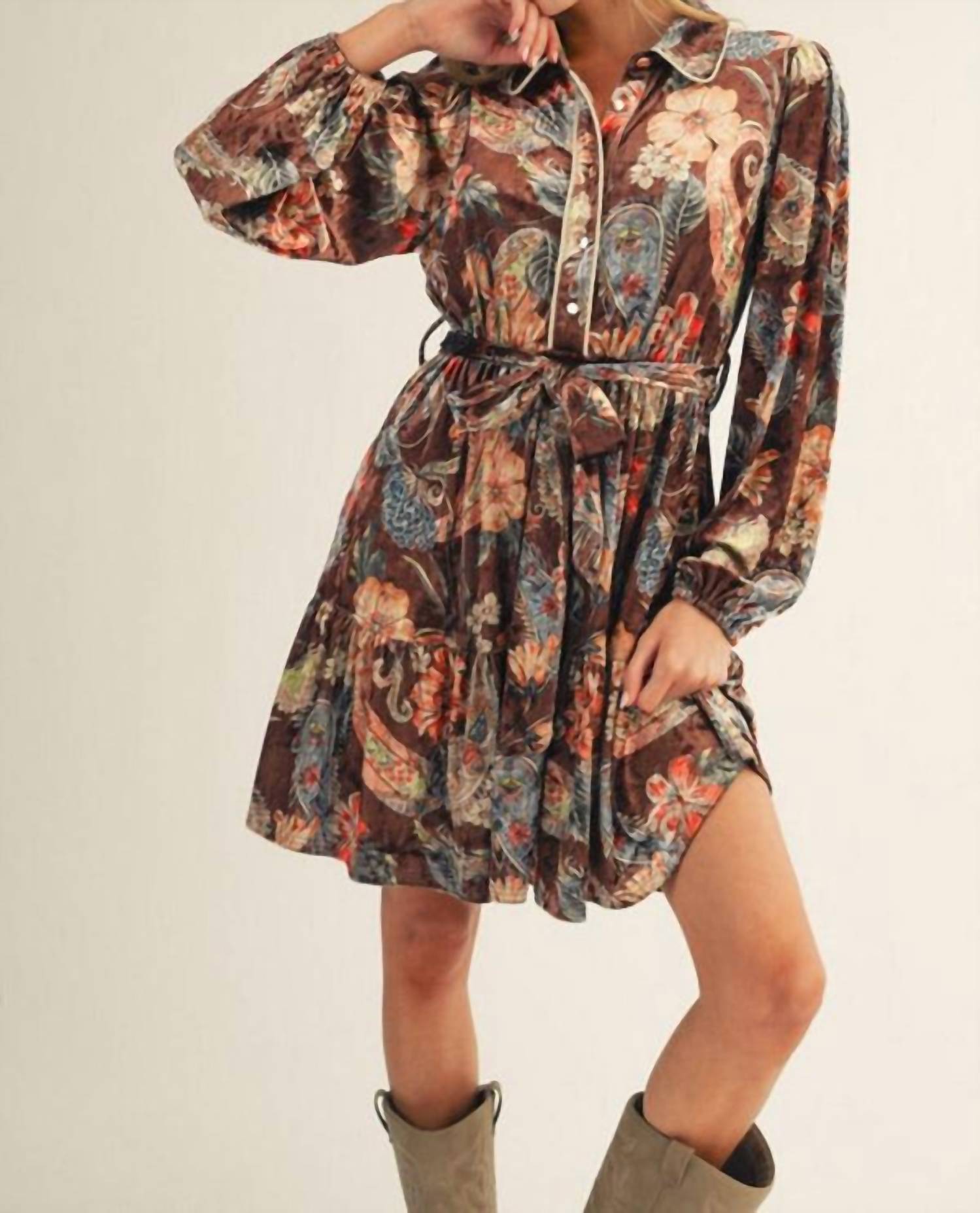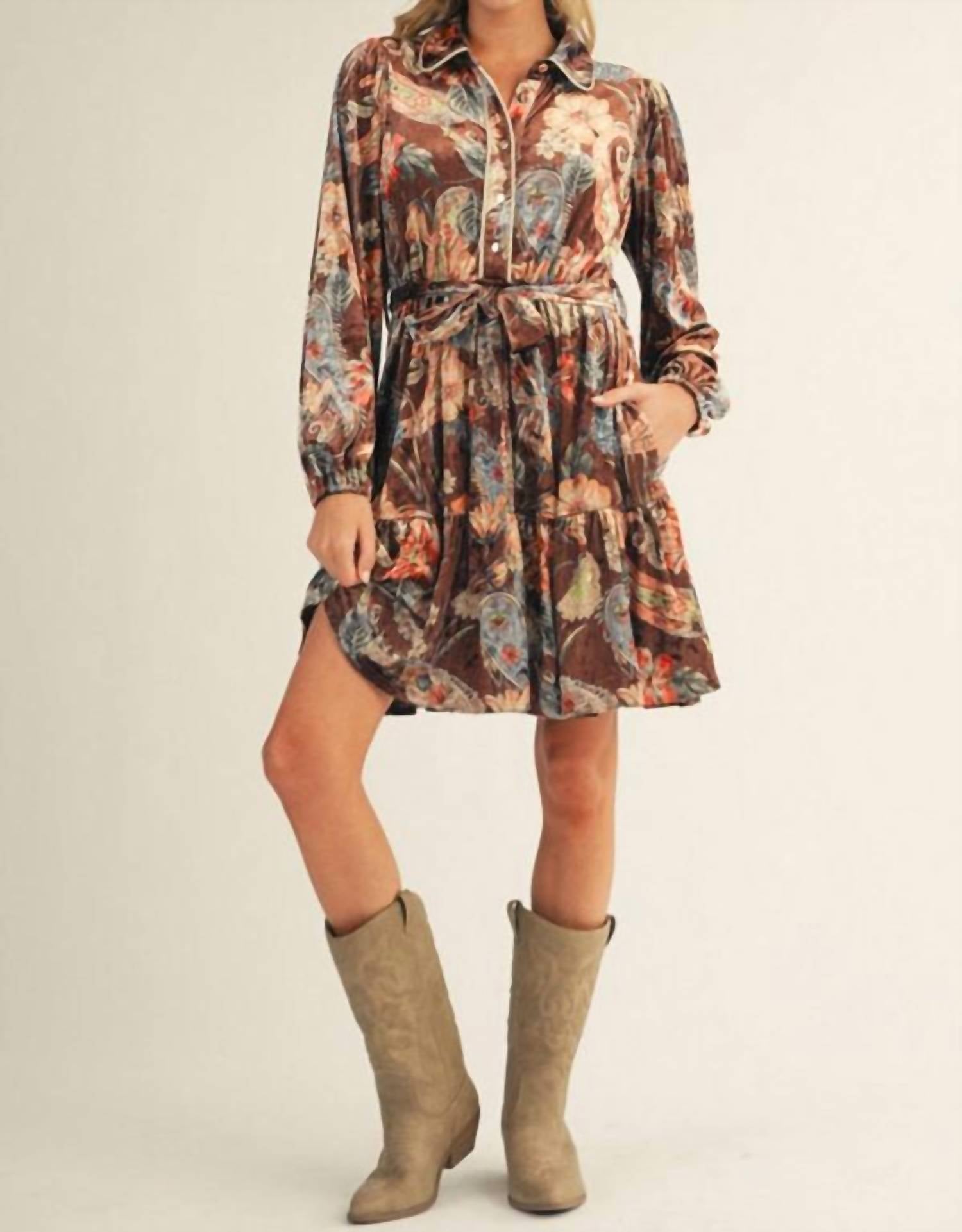 A short and breezy dress for those warmer days. The Floral Paisley Waist Tie Dress by Jodifl offers a chic Boho aesthetic in a vibrant multi-color paisley pattern. With long sleeves featuring elastic at the wrist, this mini dress boasts a half-button front with a stylish contrast trim and a collared neckline. Crafted from 95% polyester and 5% spandex, this velvet dress has a fit and flare silhouette with a tiered skirt, finishing above the knee. Closure: Button. Care: Machine wash. Ideal for engagements or Thanksgiving gatherings, it conveniently includes pockets for added functionality.