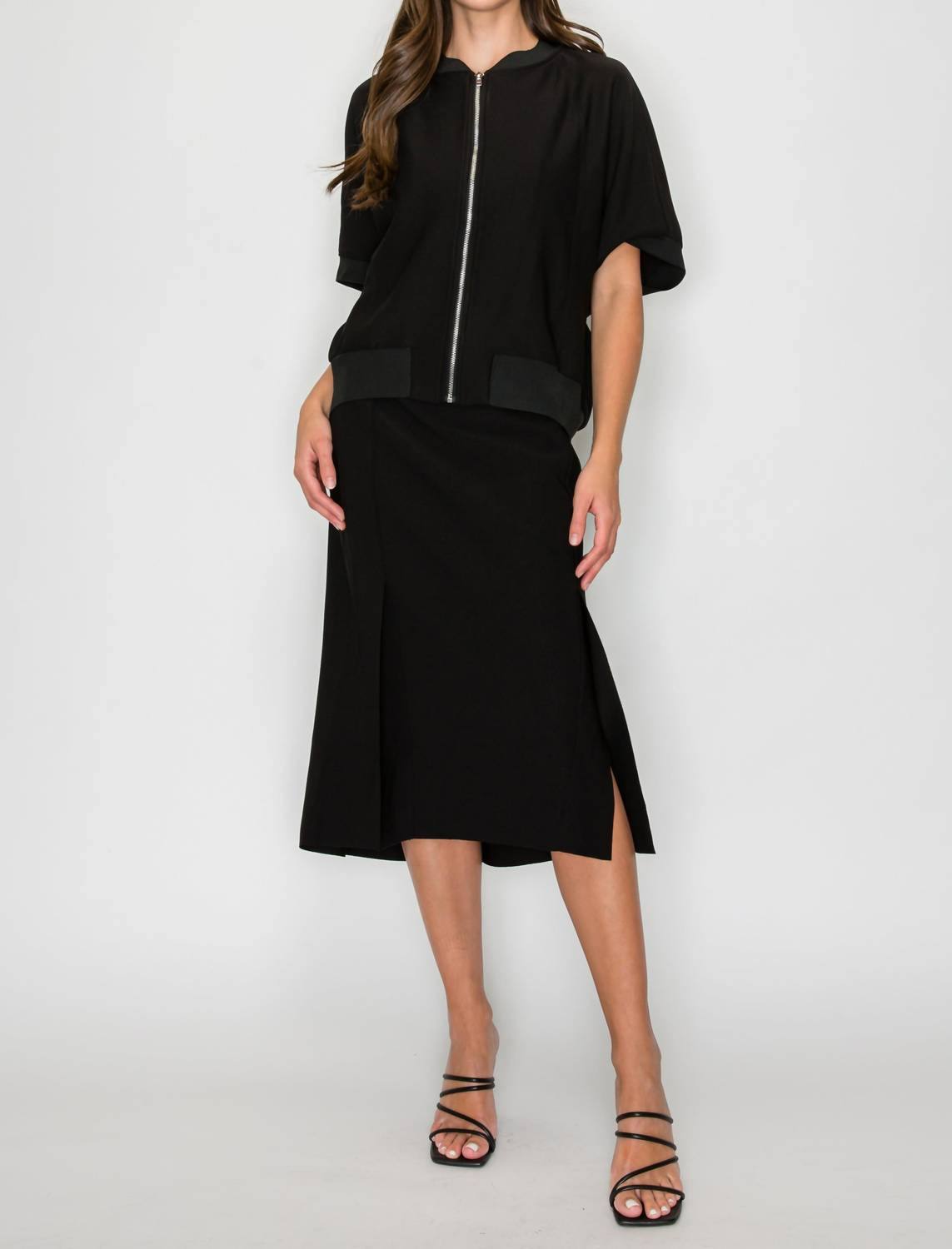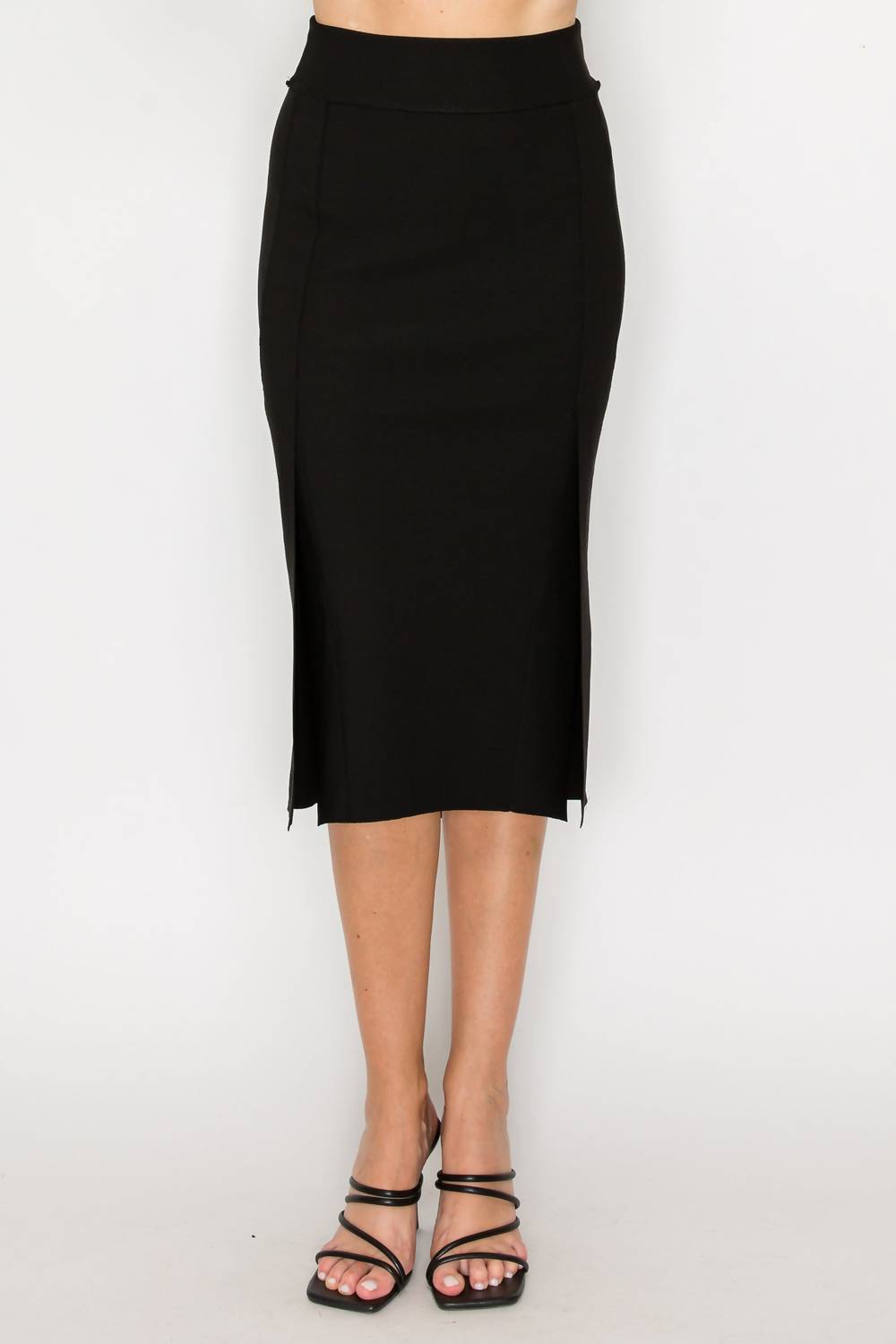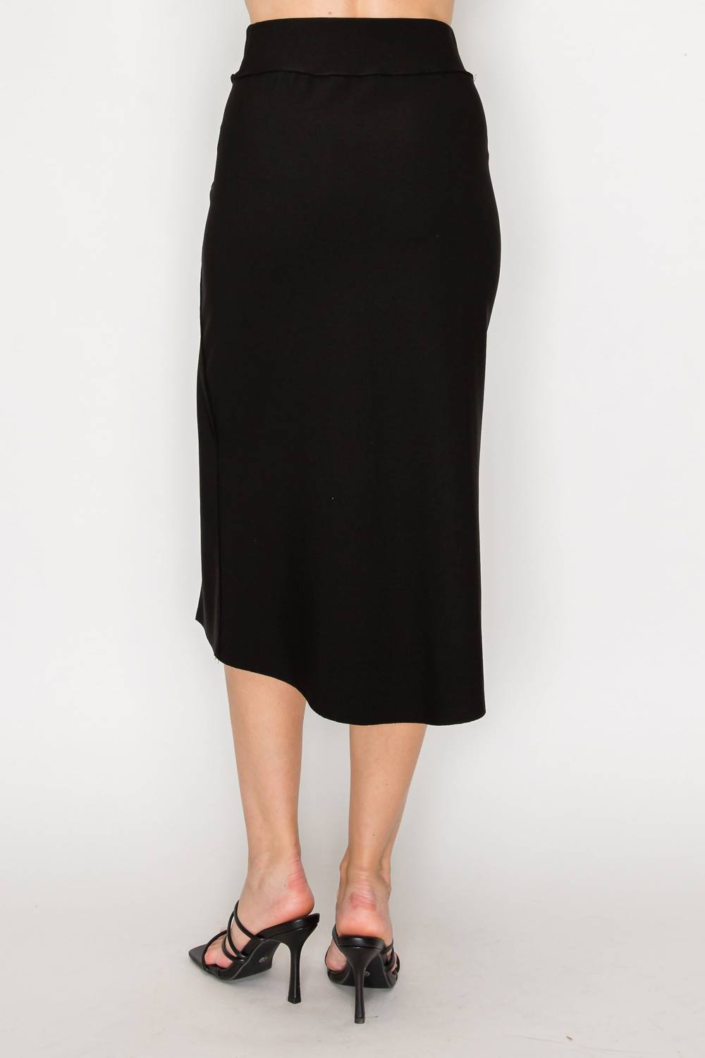The midi length skirt is here to stay and we especially love this style. Introducing the Kaman Midi Skirt by Joh, a chic addition to your wardrobe perfect for any occasion. This women's skirt is crafted from a high-quality black stretch matte crepe knit, boasting a mid-calf length for a flattering silhouette. Designed with an elastic waist and two side slits, it ensures great comfort and mobility. Composition: 94% Polyester, 6% Spandex. Closure: Pull on. Care: Hand wash and lay flat to dry. Perfect for pairing with the Kourtney or Katy Colorblock Jacket.