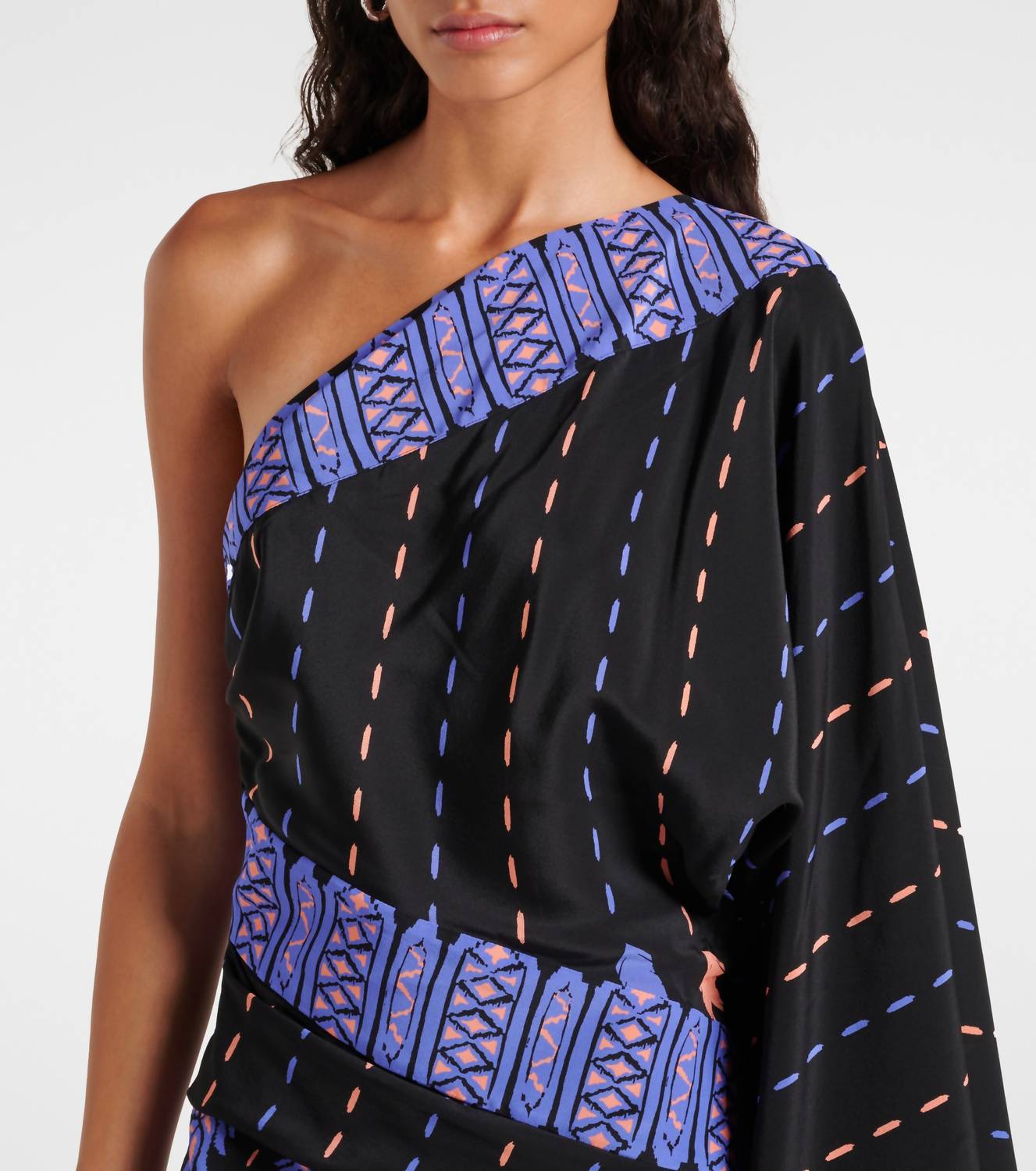 Perfectly tailored and fit to perfection. The Johanna Ortiz Black Canyon Mini Dress in nomadic black, blue, and salmon offers a luxurious look in 100% silk with a stylish geometric pattern. Designed with a one-shoulder neck and a long flared sleeve, this sheath silhouette enhances any summer vacation wardrobe. The 33" garment length falls gracefully above the knee, while the side zipper closure ensures a seamless fit. Care for this boho chic piece by dry cleaning only, making it a timeless addition to your closet.