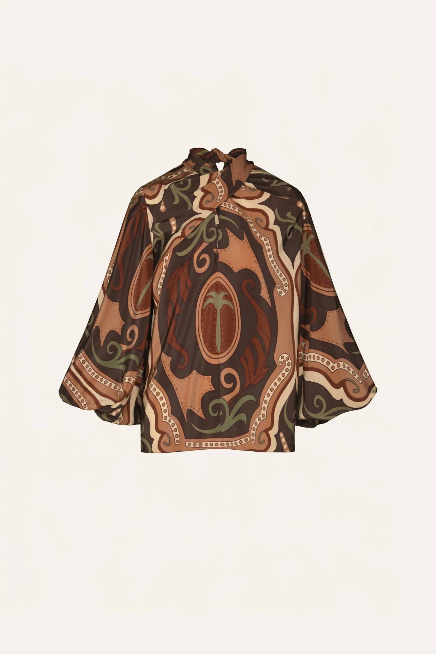 A versatile blouse that works from desk to dinner! Elevate your wardrobe with the Intricate Islands Top by Johanna Ortiz, a perfect blend of structure and fluidity. Crafted from 100% silk, this long sleeve blouse features a high neckline and a softly gathered front. Made in Colombia, its vibrant earthy tones of green, light pink, and paprika create a striking pattern. Closure: Tie closure at the back. Care: Dry clean only.
