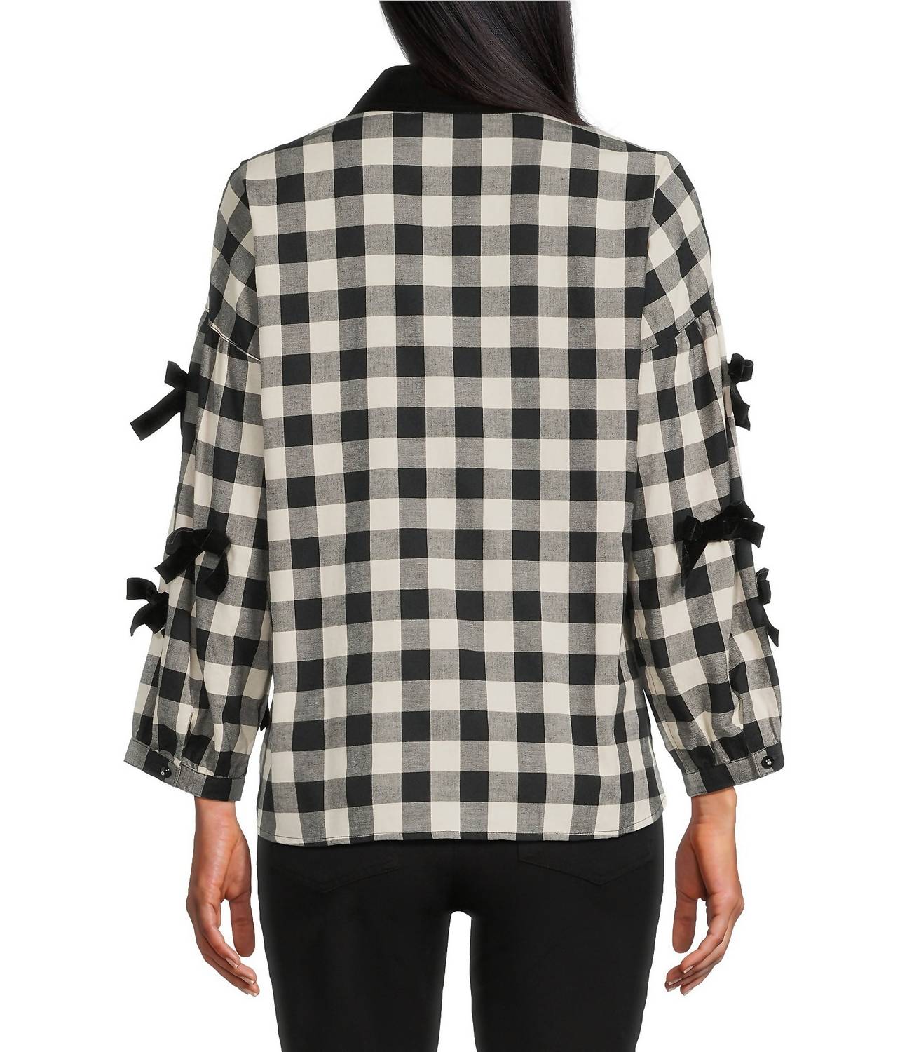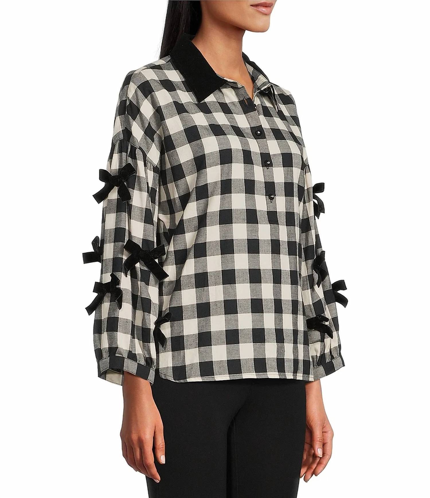 The perfect long sleeve tee that goes with just about anything. Discover the John Mark Plaid Button-Up Top, a chic addition to your casual collection with a playful twist. This long-sleeve top features a woven cotton construction and a cozy plaid pattern in black, accentuated by a luxurious velvet point collar. It boasts a button-front closure and a slight hi-low hem with side vents, offering a loose fit that enhances both comfort and style. Crafted for easy care, it's machine washable and makes an effortless statement piece for your wardrobe. Imported with an approximate 24" center front length.