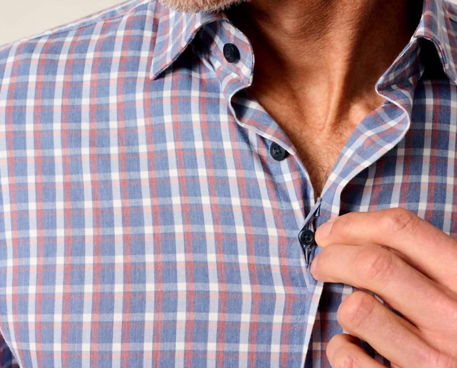 Discover the Robertson Natural Performance Shirt by JOHNNIE-O, a stylish men's casual button-down designed for comfort and versatility. Featuring long sleeves and a hidden button spread collar, this plaid & check shirt is crafted from a lightweight cotton blend containing 52% Cotton, 22% Nylon, 22% Lyocell, and 4% Spandex. Closure: Button closure. Care: Machine wash and tumble dry.
