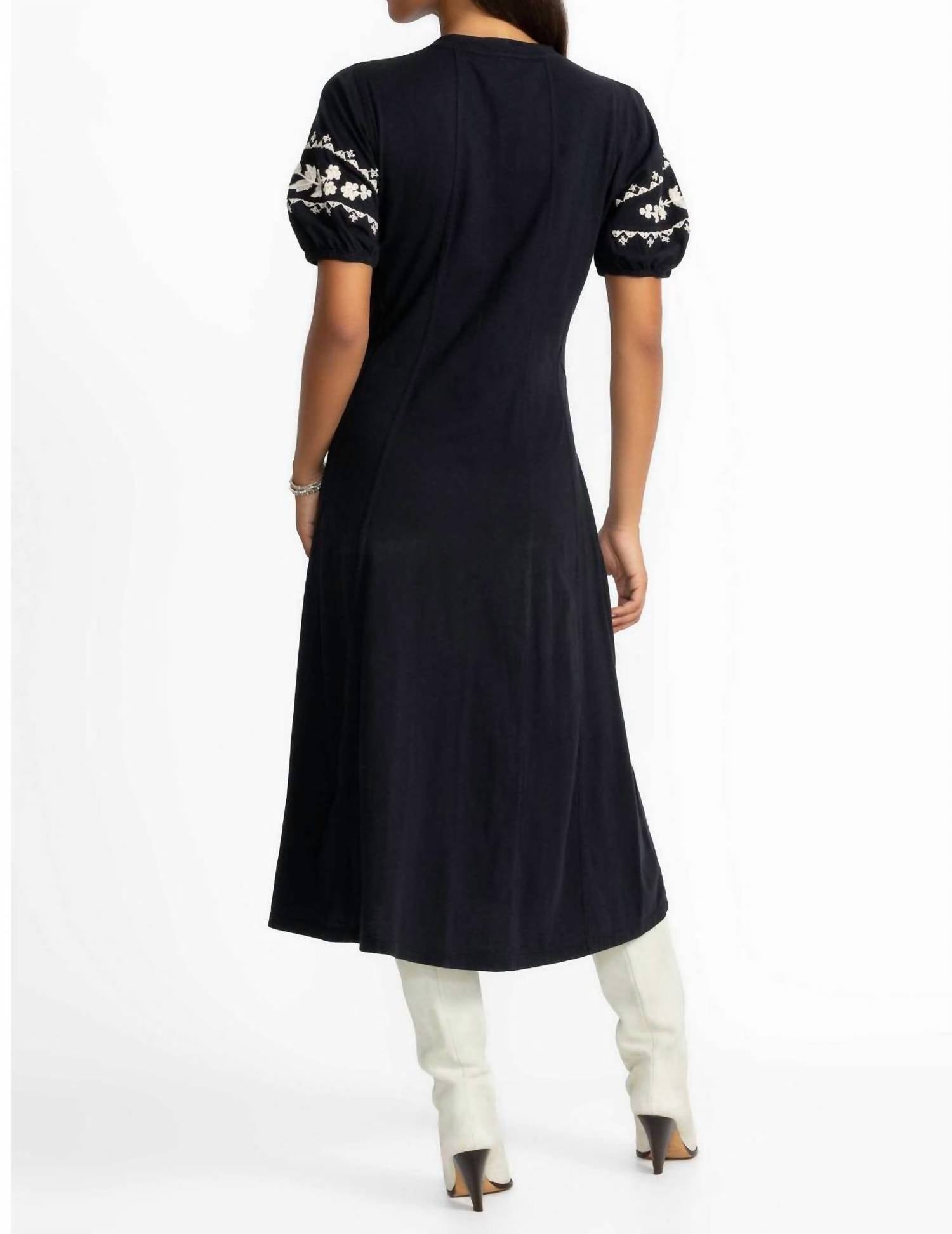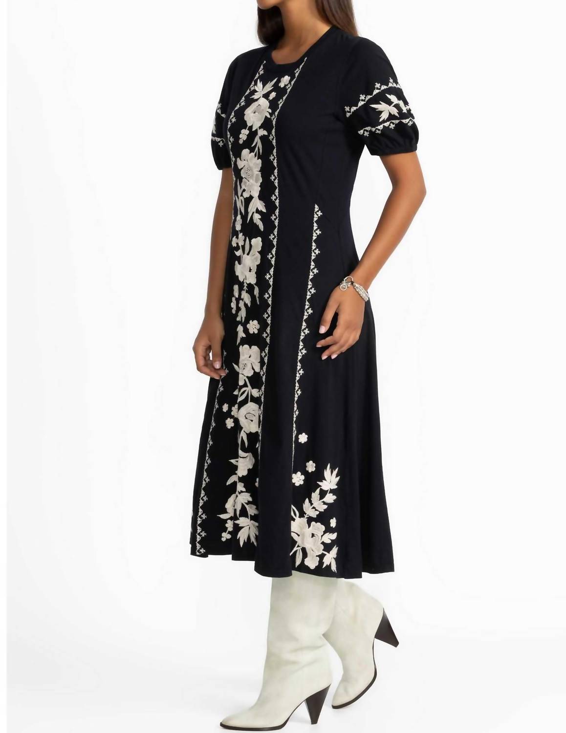 Just add slides or mules and you are good to go. Introducing the Camille Seamed Knit Dress by Johnny Was, a chic choice for your evening events. This dress, featuring short sleeves and an A-line silhouette, is crafted from 100% cotton in a striking floral pattern. The V-neck design is enhanced by a bold contrasting panel with classic princess seams, offering an elegant touch. Closure: Pull on. Care: Dry clean.