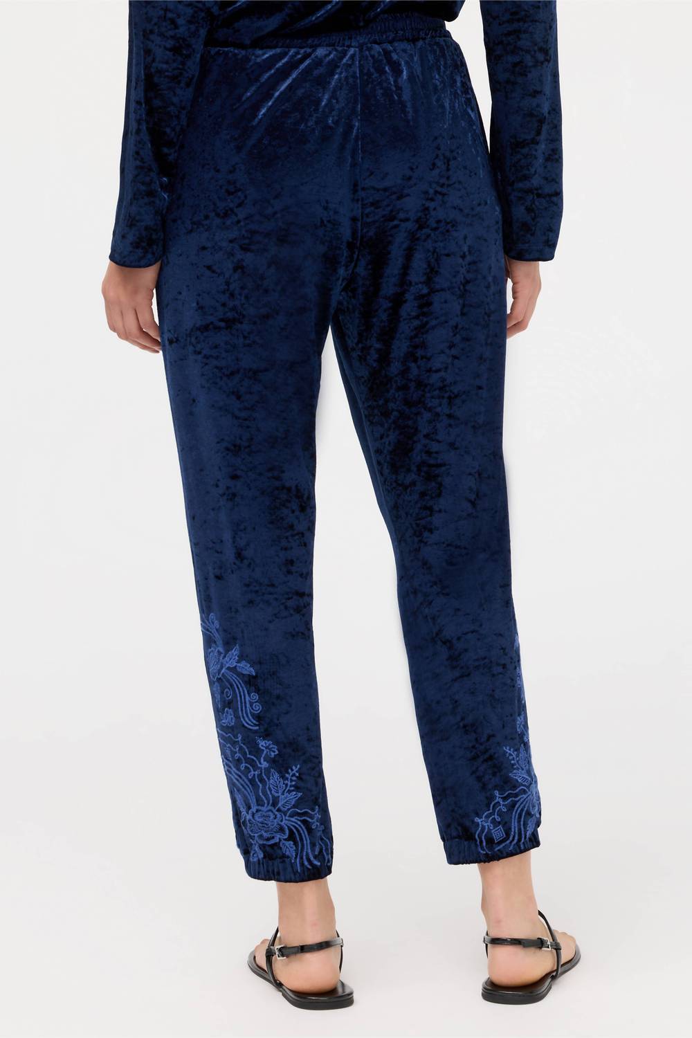 Pair these with your favorite sneakers for an effortlessly cool look. Beautifully crafted from stretch velvet, the Crushed Velvet Joggers feature intricate floral embroidery. Designed with an elastic waist and ankle cuffs, these unique pants feature pockets at the hips and on the back. The model is 5'9 1/2", wearing a size XSmall Measurements for size Medium: Front Rise- 11 1/8", Inseam - 25 3/4", Low Hip- 46 3/4" Dry Clean