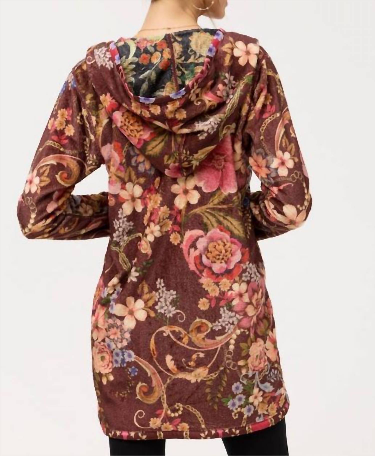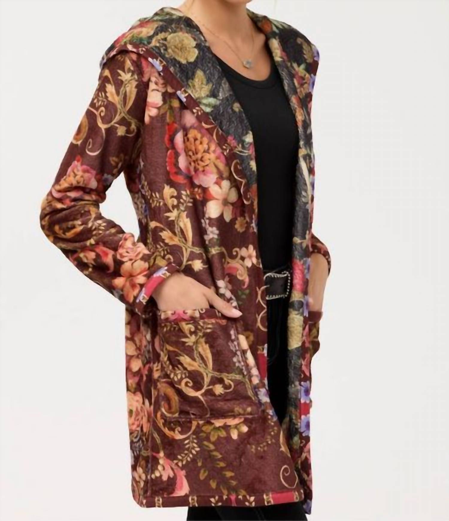 A jacket so versatile you can literally wear it with anything. The fully reversible Joan Midi Sherpa Jacket features two bold floral patterns, making it a versatile wardrobe addition. Designed with an open front and an attached hood, this cozy jacket features patch pockets at the hips. The model is 5'9 1/2" and wearing a size XSmall. Measurements for size Medium: Bust - 44 1/2", Front Length - 34" Dry Clean
