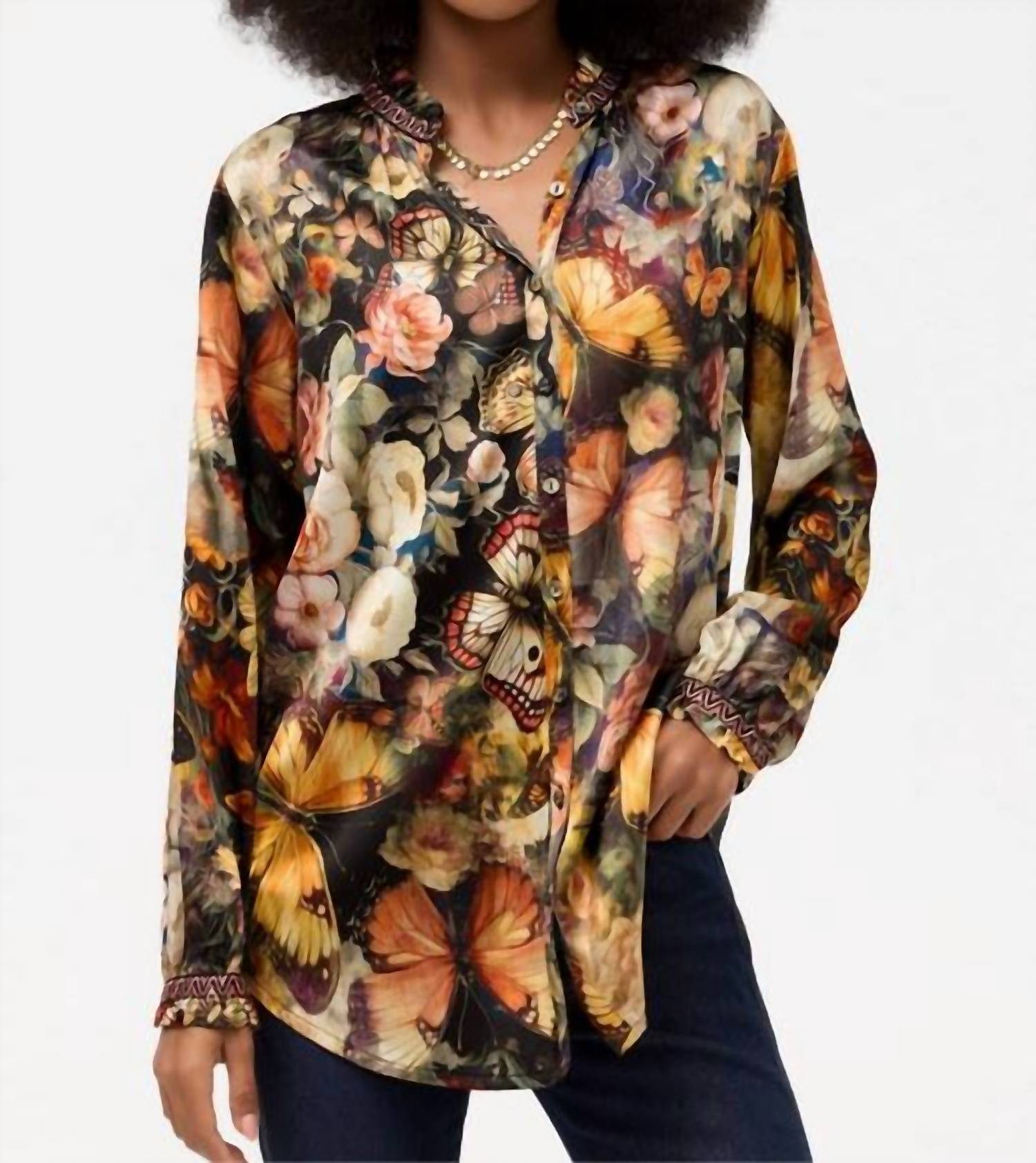 A versatile blouse that works from desk to dinner! Crafted from a sumptuous silk blend with a hint of stretch, the Yoella Tunic is embellished with a vintage-inspired floral motif. Designed with gathers and ruffles at the neck and sleeves, this button-down shirt is accented with intricately embroidered trim. The model is 5'9" and wearing a size XSmall. Measurements for size Medium: Bust - 41 1/2", Front Length - 29 1/2" Dry Clean