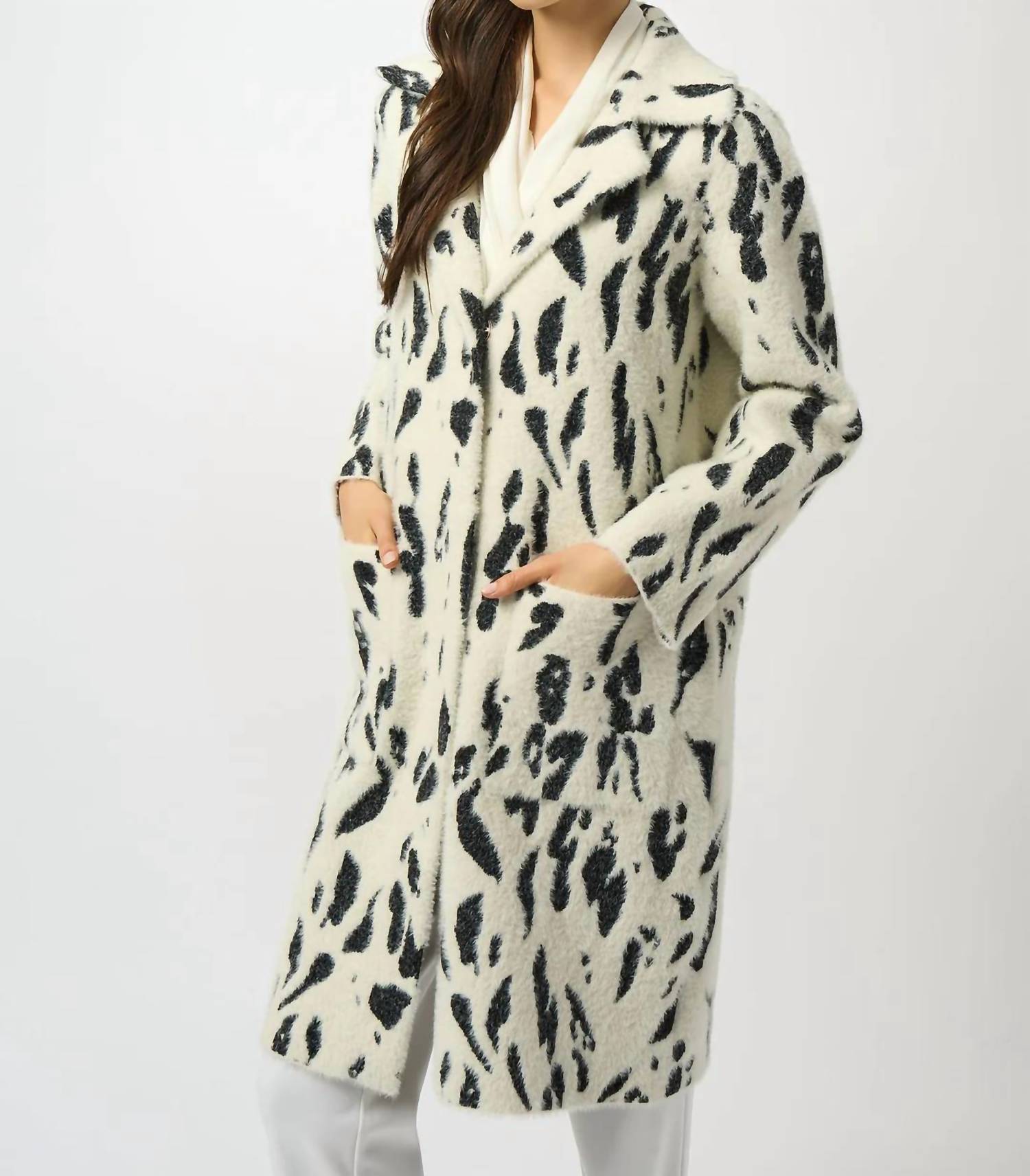 cooler temps means even cooler jackets and this stylish number doesn't dissapoint. Elevate your winter wardrobe with the Joseph Ribkoff Animal Print Faux Fur Coat in Winter White/Black, perfect for making a statement in the cold. This coat features long sleeves, crafted from a durable Nylon Blend, and falls to a mid-thigh length for added warmth. Designed in a reversible style with a button front closure and practical side pockets, this piece is made in China, ensuring top-quality craftsmanship. Care for this luxurious coat with a hand wash and lay it flat to dry, keeping it in pristine condition for many winters to come.