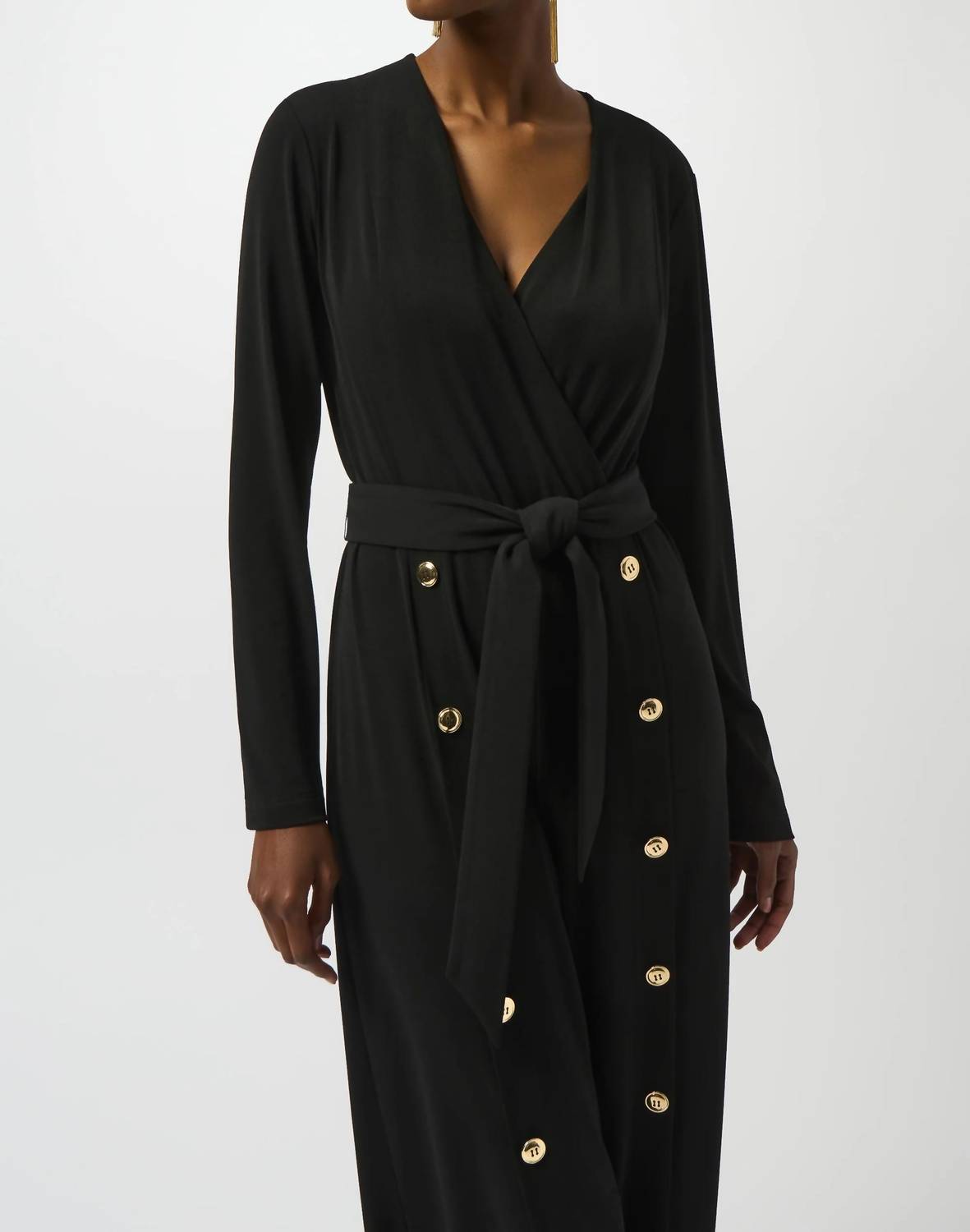 The perfect outfit choice when you you need something quick to throw on and still want to look efforlessly cool. Introducing the Joseph Ribkoff Belted Split Wide Leg Jumpsuit, a modern wardrobe staple for those who appreciate chic sophistication. This elegant jumpsuit features long sleeves and a flattering wrap v-neckline, beautifully complemented by a self-tie waist sash. Crafted from a soft stretch blend of 92% Polyester and 8% Spandex, it boasts a full-length wide leg with a split front hem and glamorous gold button accents, all meticulously made in Canada. Care instructions advise hand washing in cold water, line drying in the shade, and ironing only when necessary.