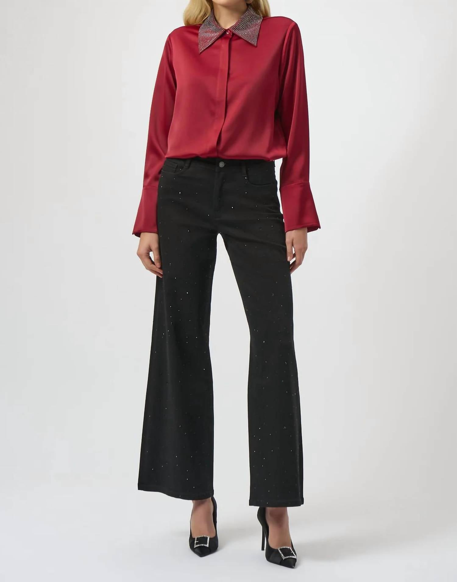 A flattering silhouette that's suprisingly versatile. Embrace timeless elegance with the Joseph Ribkoff Embellished Classic Wide Leg Jeans in a rich black hue, perfect for stylish engagements. These versatile jeans offer a flattering wide-leg fit and feature all-over rhinestone detailing that adds a touch of sophistication to any outfit. Crafted from a cotton blend, these Canadian-made jeans provide comfort and style, complete with a practical button closure and side pockets for added convenience. Care for these jeans by hand washing, line drying, and avoiding ironing on trims for long-lasting wear.