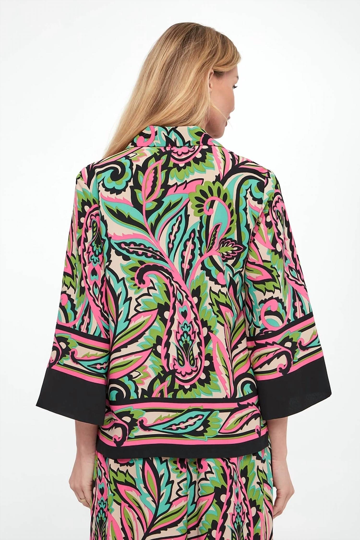 A versatile blouse that works from desk to dinner! Elevate your vacation wardrobe with the Paisley Print Boxy Top by Joseph Ribkoff, perfect for adding a boho chic flair to your spring outfits. It features a vibrant black and multi-color paisley pattern, with a collar and three-quarter sleeves that enhance its relaxed fit. Composition: 100% Polyester. Closure: Pull on. Care: Hand wash and line dry for long-lasting wear.