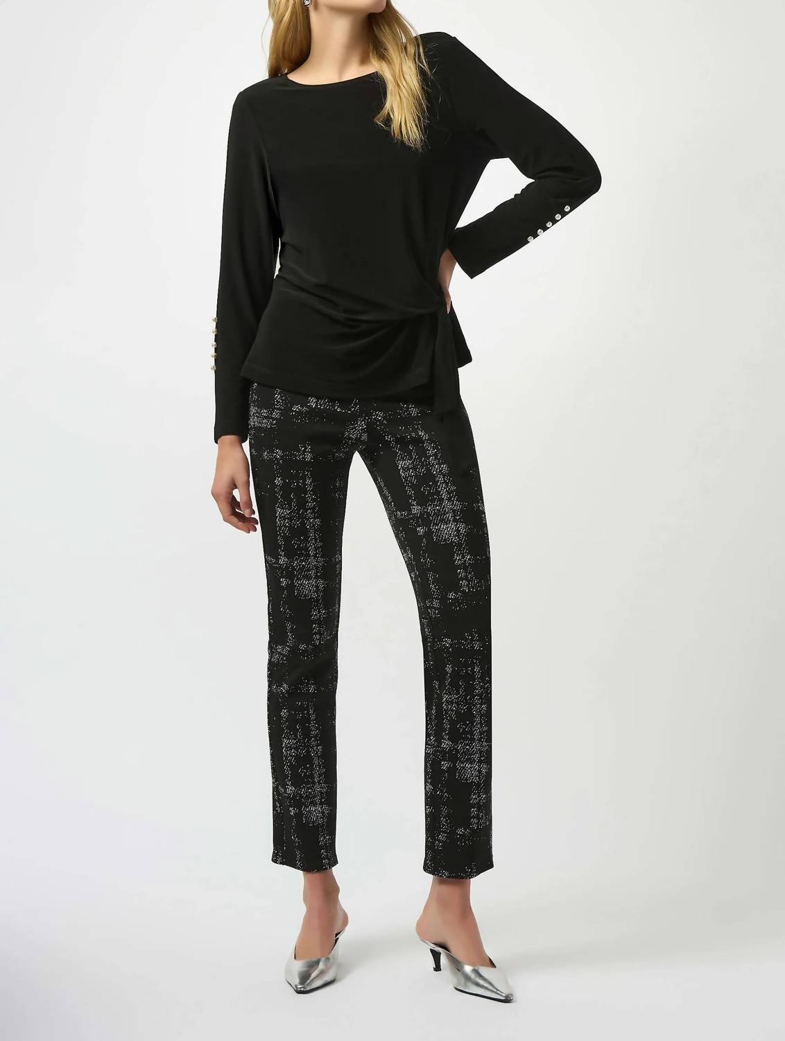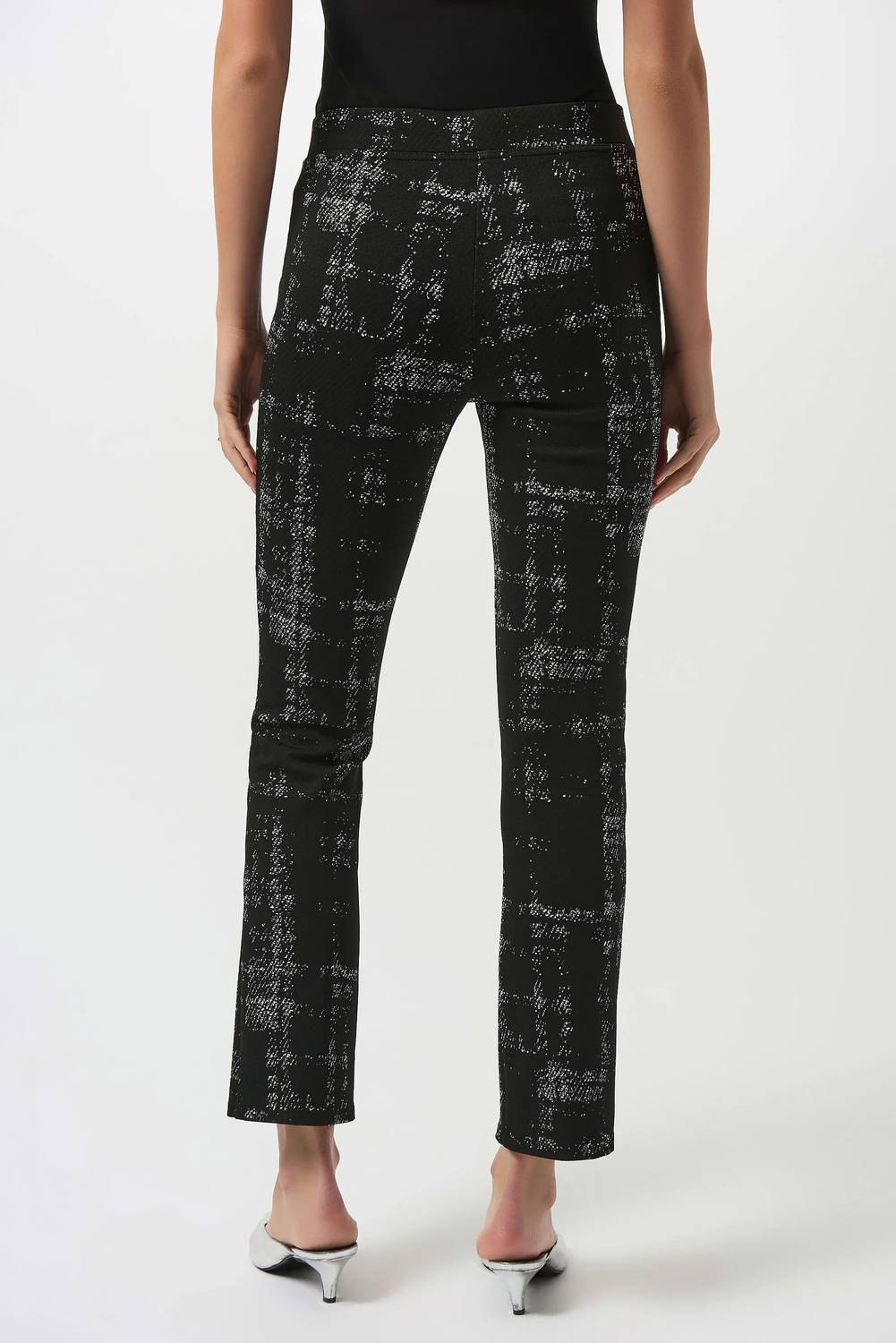 Enhance your wardrobe with this trendy cropped number, designed to blend style and practicality. The comfortable fit allows for easy all-day wear. The perfect length to pair with your favorite mules. Step into effortless sophistication with the Joseph Ribkoff Plaid Pull On Pant, perfect for the transitional fall season. Crafted in a luxurious jacquard sweater knit fabric featuring a striking black and off-white plaid print, these ankle-length pants offer a chic straight-leg silhouette. The high-rise design incorporates a covered elastic waistband for a comfortable and flattering fit, making it an ideal choice for workwear. Composition: 80% Nylon, 18% Polyester, 2% Spandex. Closure: Pull-on. Care: Hand wash cold with like colors, lay flat to dry.