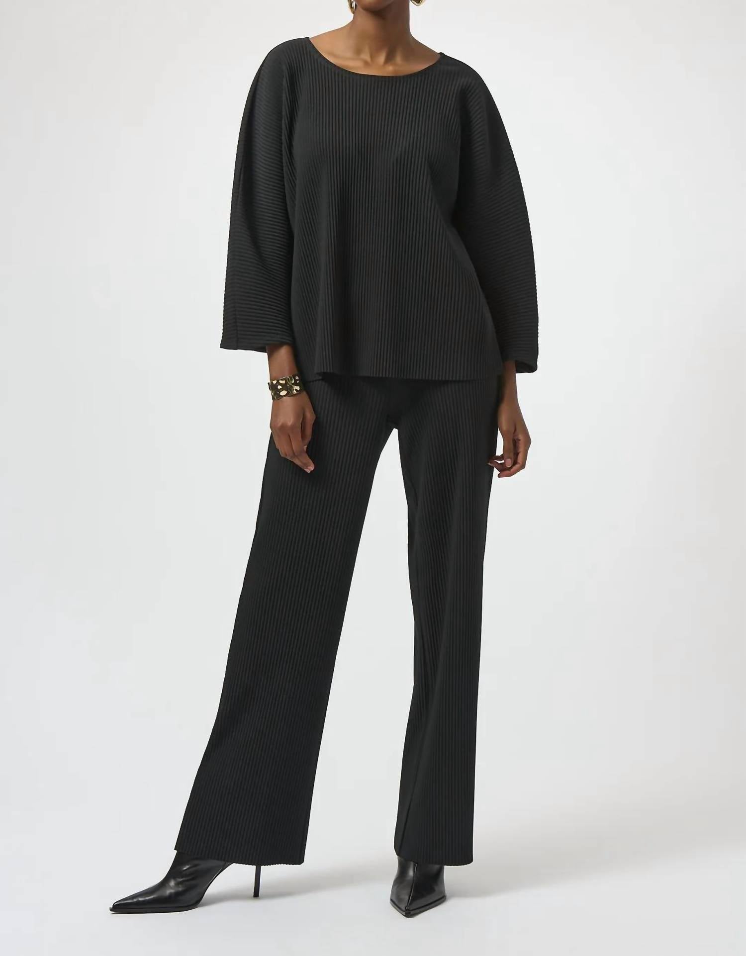 Great fit, cute design, soft fabric. You'll love everything about this long sleeve tee. Enhance your collection with the Joseph Ribkoff Pleated 3/4 Sleeves Top, a perfect blend of comfort and style in chic black. This top features three-quarter dolman sleeves and a flattering scoop neckline, ideal for a day-to-night transition. Crafted from 95% Polyester and 5% Spandex, it offers a sophisticated pleated design. With a pull-on closure, this top is made in Canada and requires hand wash in cold water; lay flat to dry.