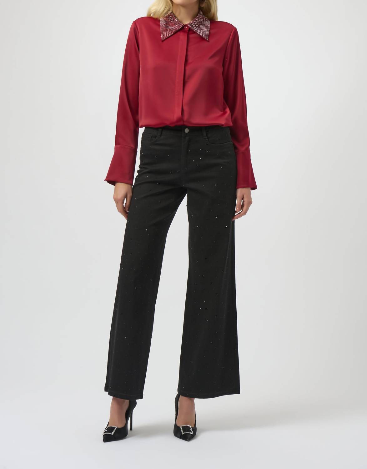 A versatile blouse that works from desk to dinner! Elevate your wardrobe with the Satin Button-Front Blouse with Embellished Collar by Joseph Ribkoff, perfect for any summer occasion. Crafted from a lustrous deep cherry polyester blend with long cuffed sleeves, this blouse is a symphony of sophistication and versatility. The solid pattern and crystal embellished collar add a touch of refined elegance, making it ideal for holiday parties or workwear ensembles. Closure: Button closure. Care: Hand wash and line dry.