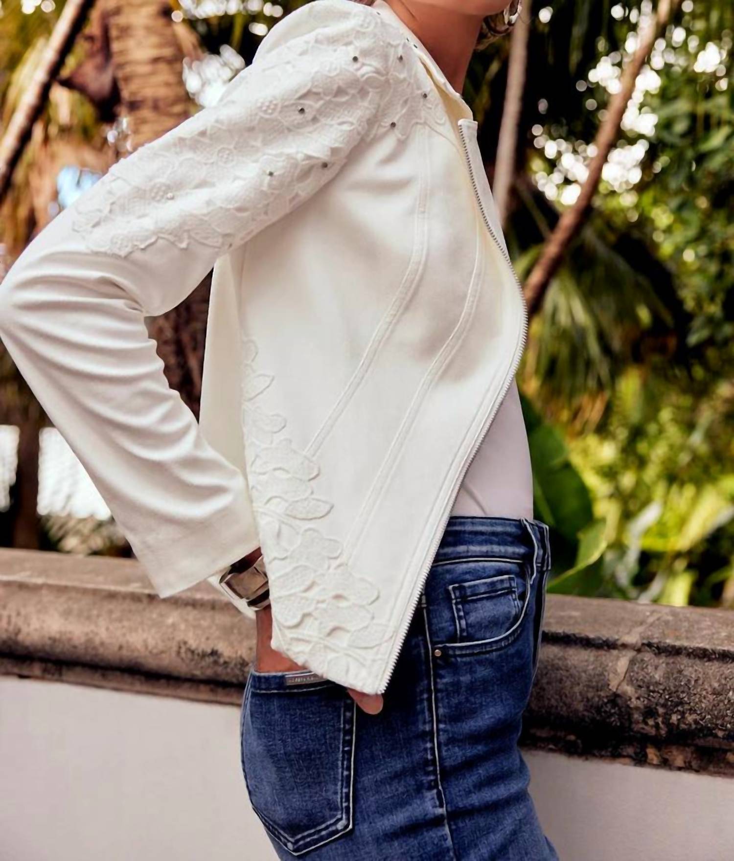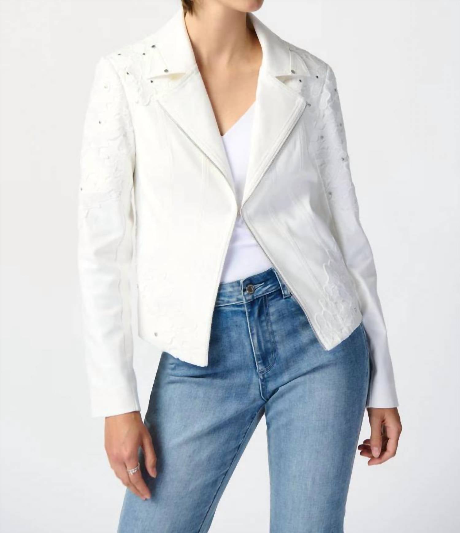 An elevated version of your favorite classic blazer. Embrace elegance with the Joseph Ribkoff Studded Faux Suede Jacket in a chic Vanilla hue, perfect for your next holiday party. This long-sleeve jacket features exquisite floral lace details on the shoulders, sleeves, and collar tips, enhanced with contrasting flat studs for a modern edge. Crafted from 90% polyester and 10% spandex, this textured, minimalist piece offers both comfort and style. Closure: Discreet front zip closure. Care: Hand wash and line dry.