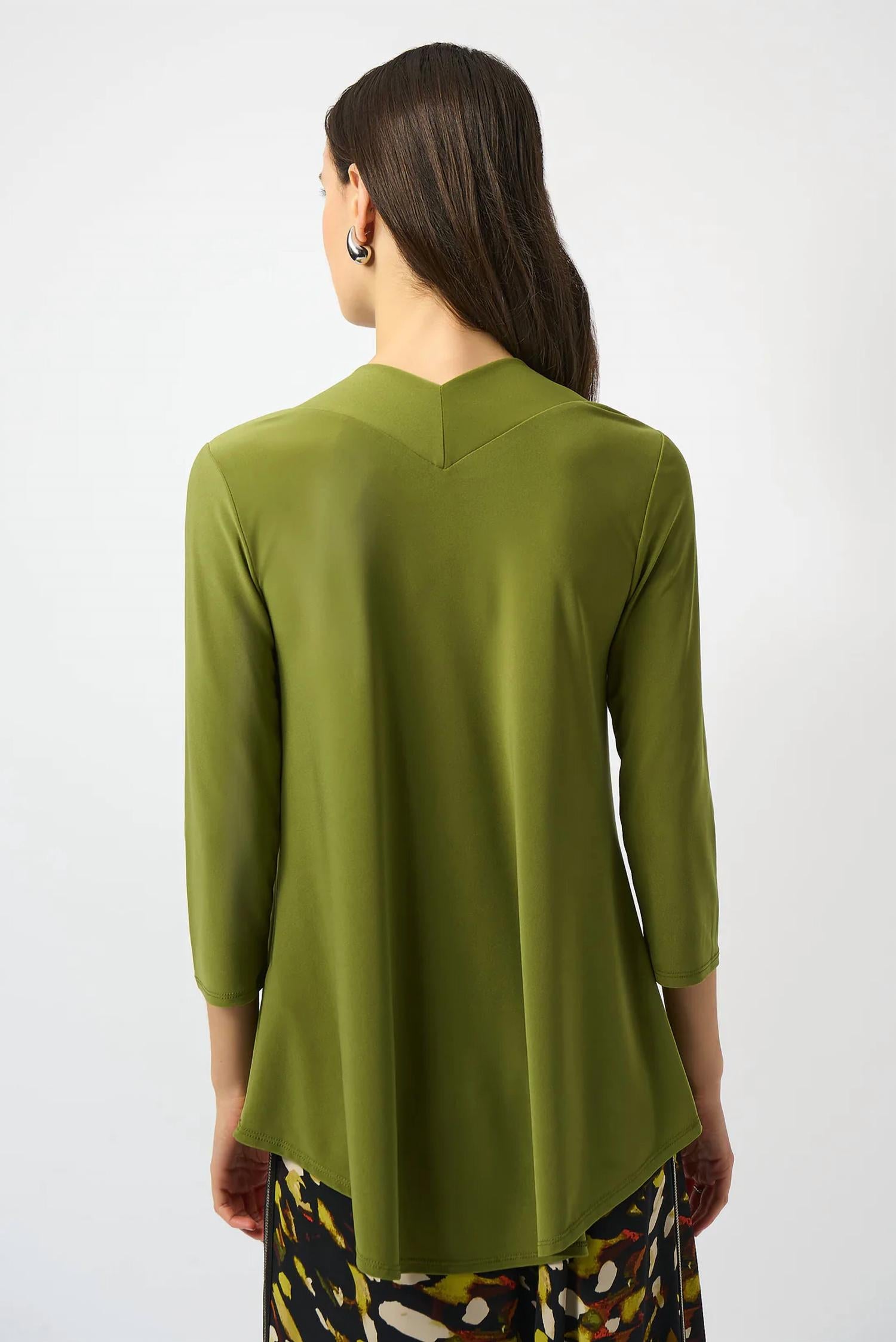 A long sleeve top you can wear with denim, skirts, well... just about anything! Elevate your style with the Joseph Ribkoff V-neck 3/4 Sleeve Flared Top in Artichoke, designed to complement both professional and casual settings. This top features three-quarter puffed sleeves and a flattering rounded V-neckline accented with a tasteful ornament, adding a touch of elegance. Composition: 96% Polyester, 4% Spandex. Closure: Pull-on style. Care: Hand wash cold with like colors, hang to dry in the shade, low iron on reverse side only if needed. This minimalist piece is imported and crafted to enhance your natural grace.