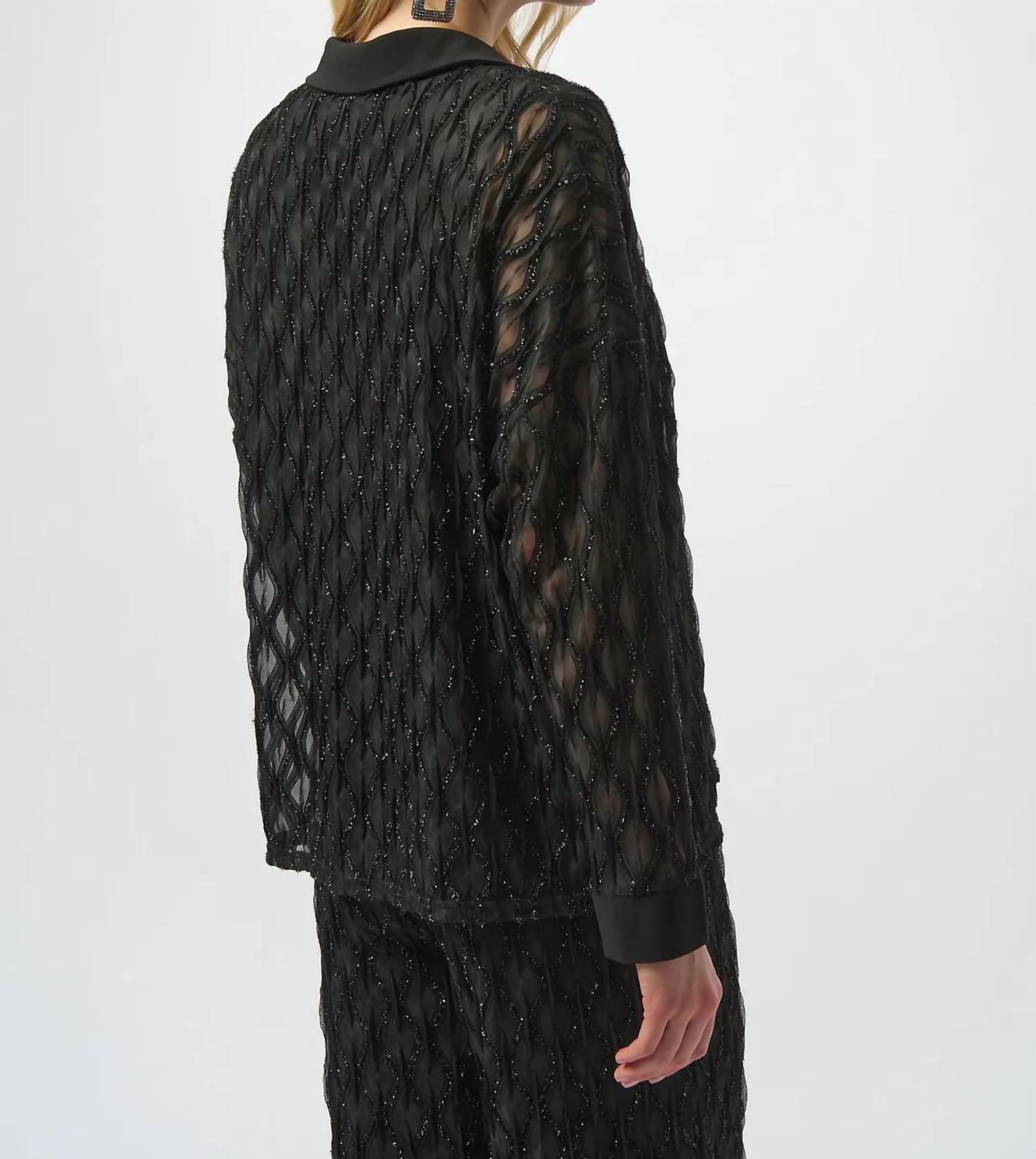 A timeless blouse that will never go out of style. Enhance your wardrobe with the Joseph Ribkoff V-neck Collared Long Sleeve Top, perfect for adding a touch of sophistication to any outfit. This exquisite blouse features long, flowing dolman sleeves with fitted cuffs, offering a graceful silhouette in classic black. Composition: 96% Polyester, 4% Spandex. Closure: Pullover. Made in Canada. Care: Hand wash in cold water with like colors, do not iron, lay flat to dry in the shade.