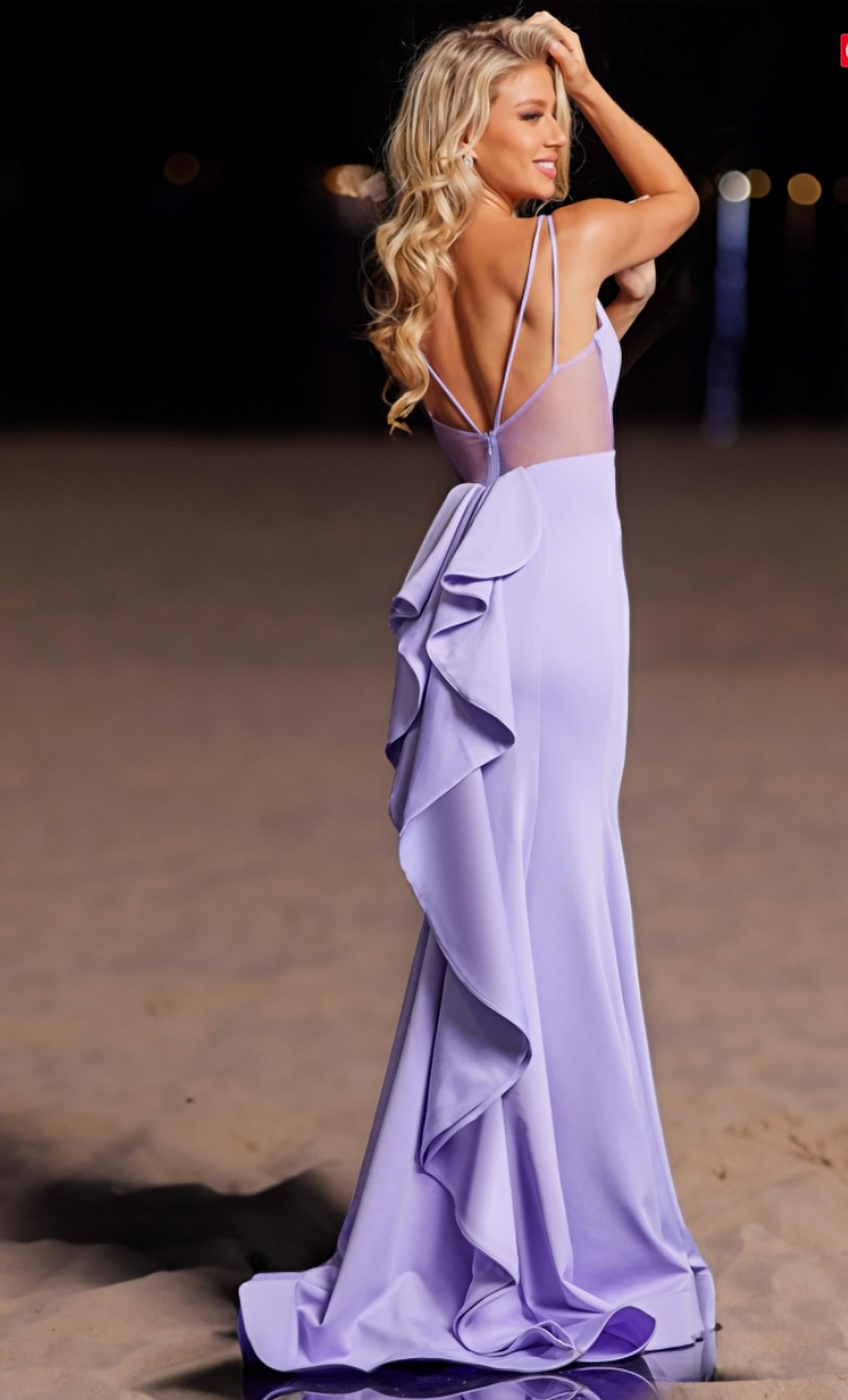 Style this maxi with your favorite statement necklace and sandals for the perfect look. Elevate your evening look with the V-neck Elegant Maxi Prom Gown by JOVANI, a stunning choice for spring celebrations. This lilac dress is tailored in a sophisticated mermaid silhouette with a sleeveless design and a flattering V-neckline, perfect for holiday parties or Valentine's Day events. With its solid pattern offering a chic and minimalist appeal, this gown is made for a striking maximalist impression. Care for your gown by opting for dry cleaning to preserve its elegance for many occasions to come.