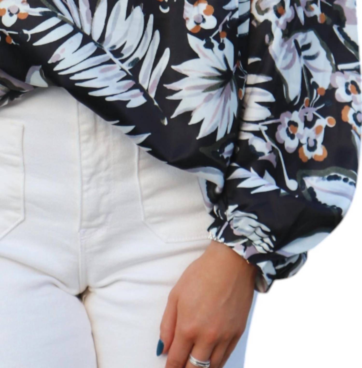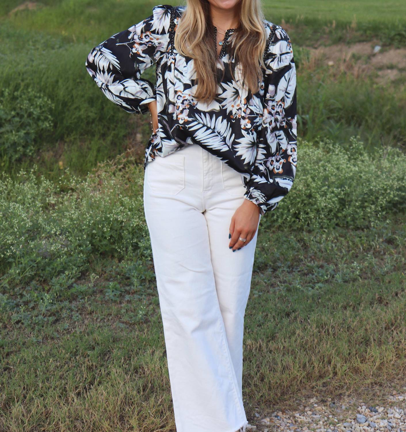 A versatile blouse that works from desk to dinner! Introducing the Casey Floral Top by Joy Joy, a stunning addition to your spring wardrobe in a chic black and white floral pattern. This blouse features long sleeves and a stylish V-neckline, making it perfect for dinner parties or Thanksgiving gatherings. Crafted from 100% polyester, it offers a comfortable pull-on closure for ease of wear. Model is wearing a size X-Small.