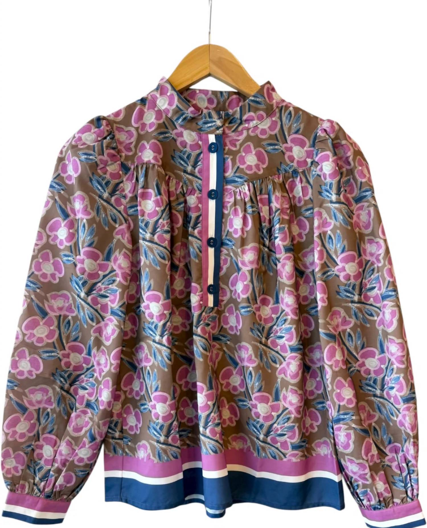 A timeless blouse that will never go out of style. Purple, blue, brown and cream floral printed long sleeve three quarter button down top. Buttons are fabric lined and are navy blue. Stripe feature on the button closure and hem. Not lined, lightweight material! Fitting true to size.