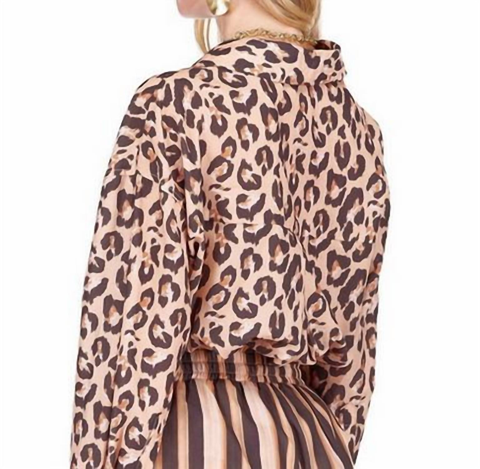 Pair this with your favorite jeans and slides for your next girls night out. Introducing the Oversized Animal Print Blouse by Joy Joy, a striking addition to your fall wardrobe with its bold brown leopard pattern. This blouse features short sleeves and is made from a comfortable cotton blend, offering a relaxed fit perfect for casual occasions. The collar neckline and button closure add sophisticated touches to its playful, 90s-inspired design. Mix and match this versatile piece to embrace a fun, confident style.
