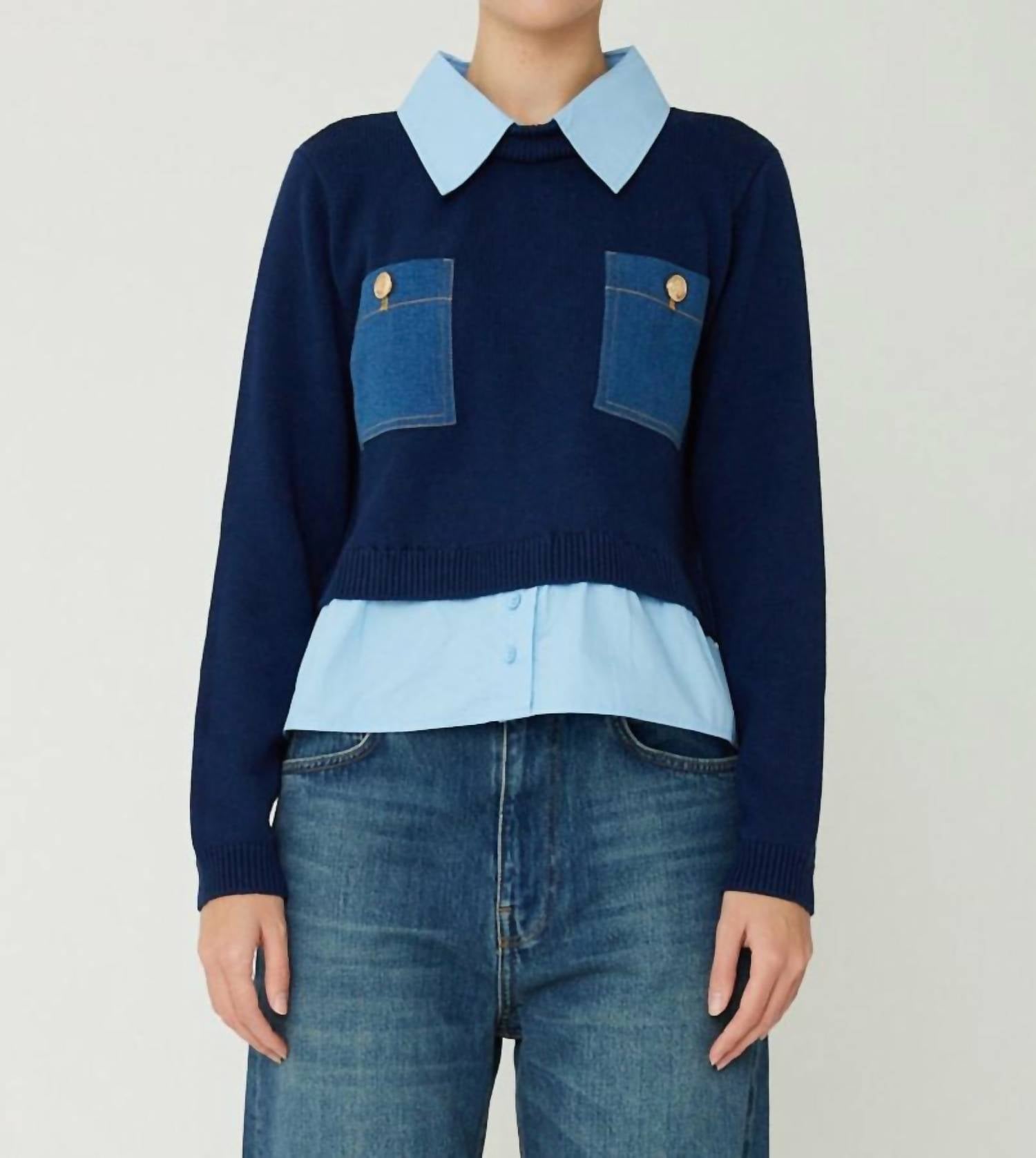 Throw this adorable cardigan over any cami or tank top. Introducing the Leila Cropped Sweater by JS71, a chic piece in a sophisticated navy and light blue colorway. It features long sleeves, a solid pattern, and a collar neckline, effortlessly blending a sweater-over-shirt appearance with intricate gold hardware on the chest pockets. This cardigan is designed for women and boasts a pull-on closure for convenient wear. To maintain its pristine condition, hand wash and lay flat to dry.