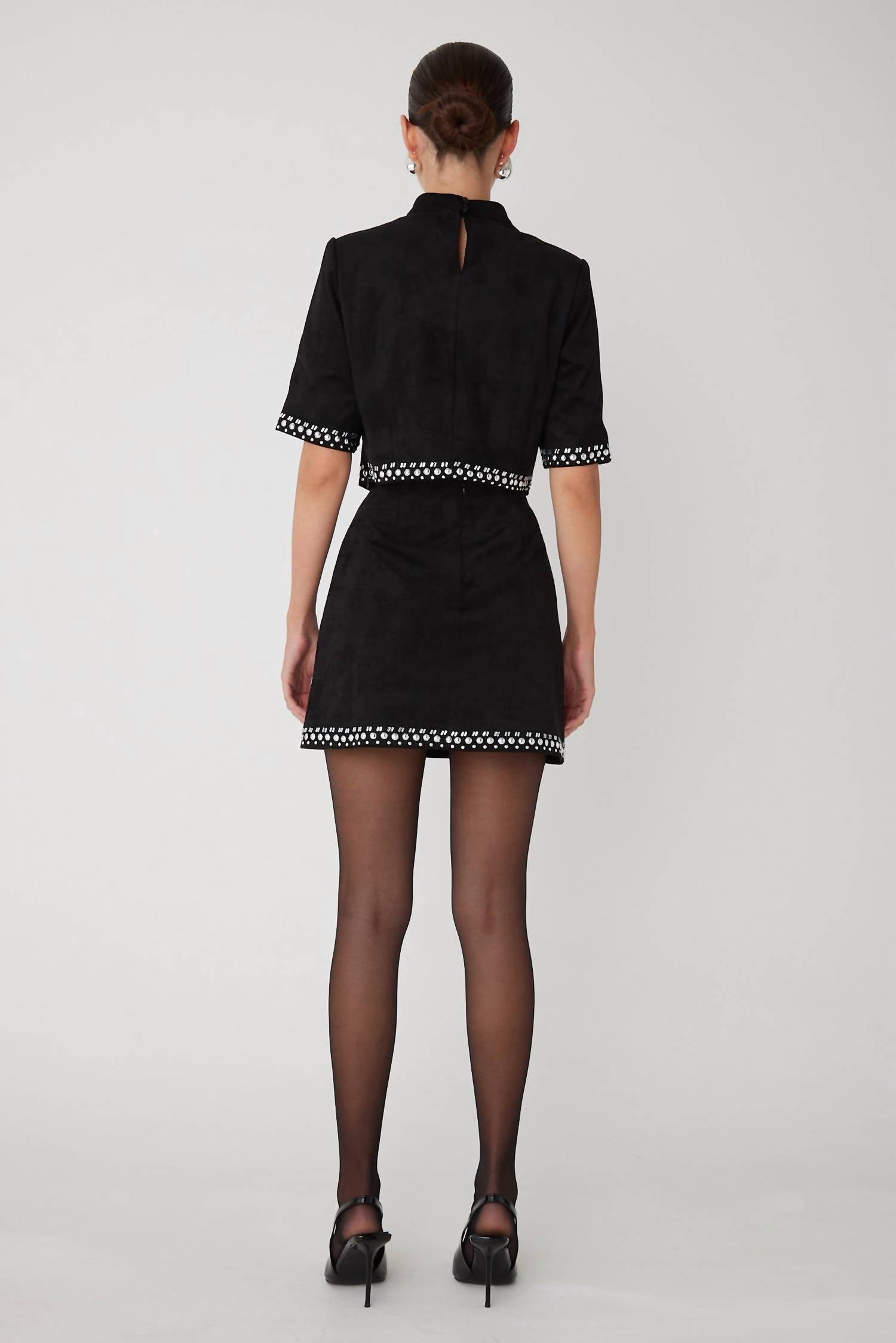Infuse your wardrobe with elegance and comfort with the Zoe Top and Skirt Set by JS71. This monochrome ensemble, ideal for dinner parties, includes an elbow sleeve mock neck top paired with an A-line skirt, both adorned with silver stud accents. Made from ultra-soft, stretchy black faux suede, this set promises refined glamour. Closure: Button closure. Care: Dry clean only.