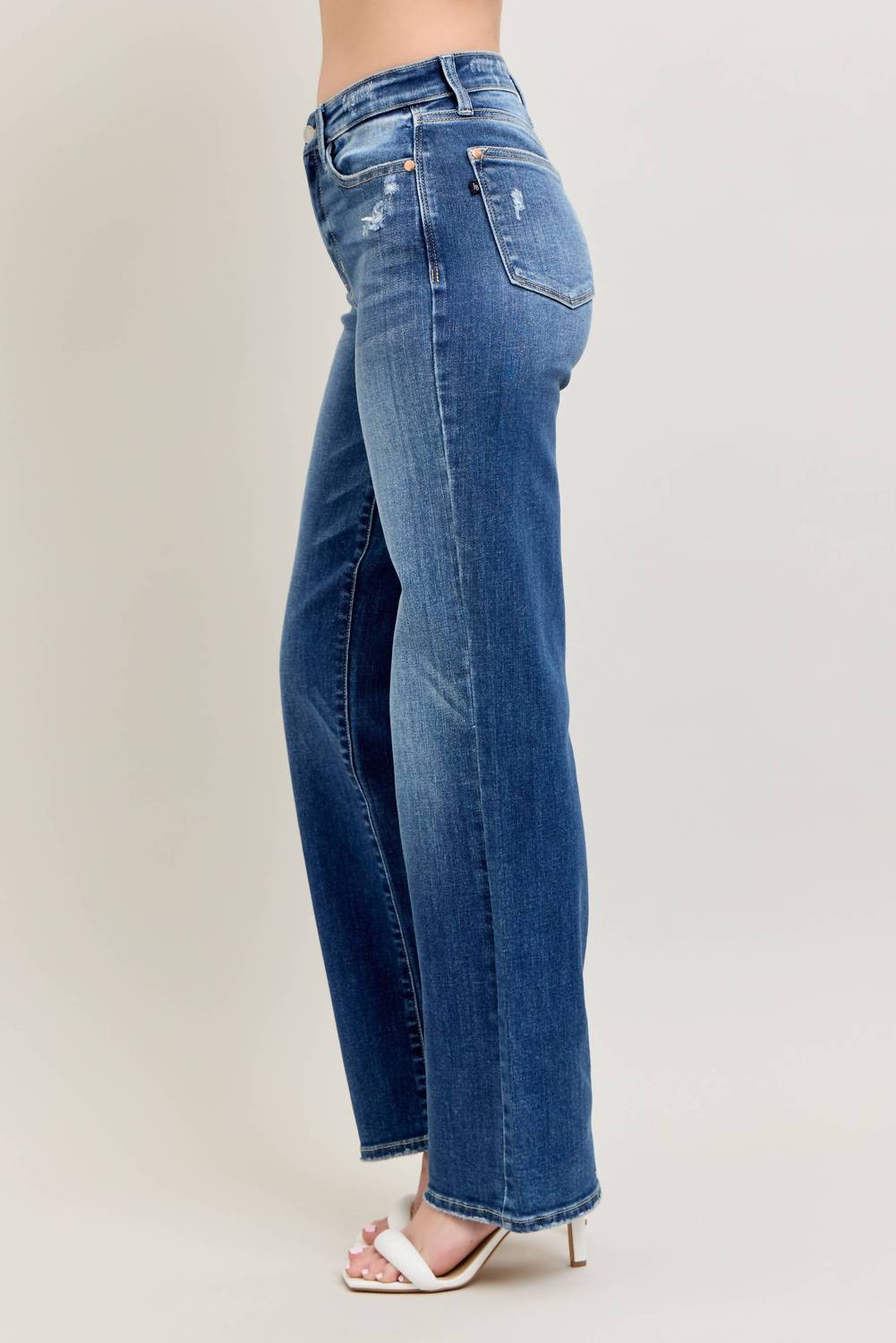 Pair these straight leg jeans with flats, sandals or even heels! You can't go wrong. Introducing the 90's Straight Leg Jeans by Judy Blue, a stylish nod to retro fashion in a dark wash. Crafted with a comfortable blend of 93% cotton, 6% polyester, and 1% spandex, these jeans offer a relaxed fit with a 12-inch front rise and a 32-inch inseam. The jeans feature a convenient zip closure and a practical solid pattern with pockets, perfect for everyday wear. Care is straightforward with machine wash and tumble dry instructions, making these jeans a streetwear staple for summer.