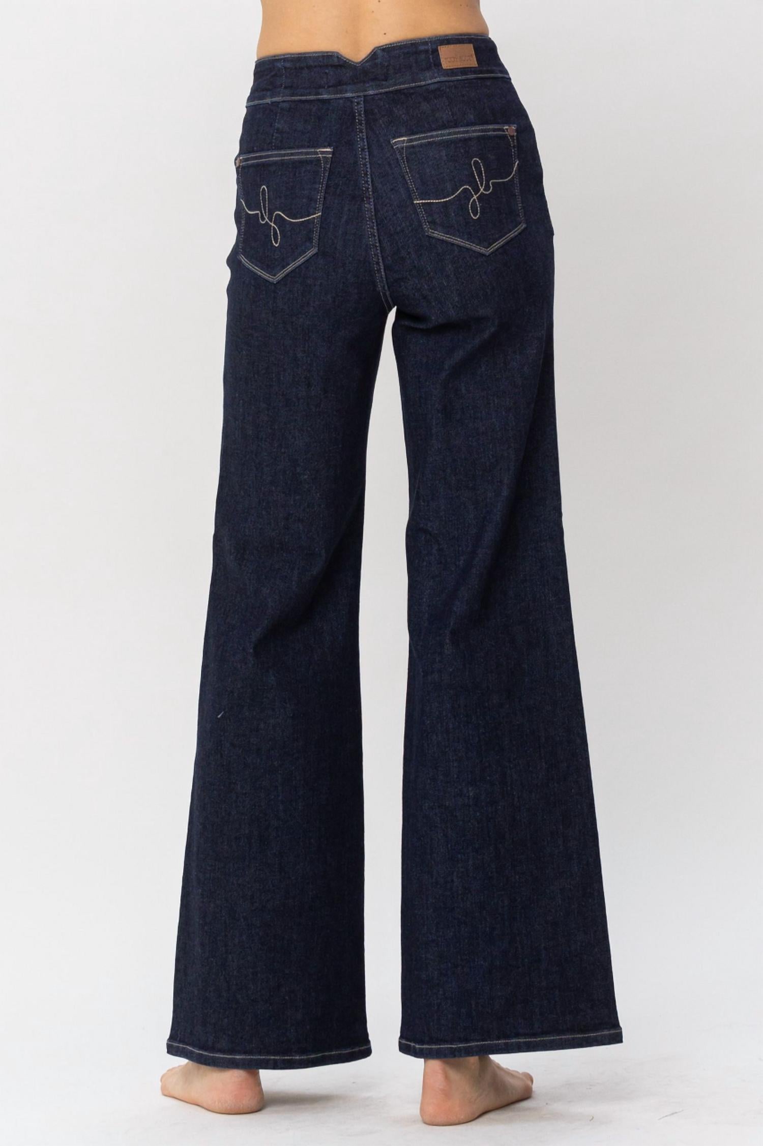 Pair these wide leg jeans with mules, slides or your favorite strappy sandals. Unveil a statement with Judy Blue's High Waist Rinse Wash Geometric Waistband Jeans, tailored for a modern fall wardrobe. These women’s jeans boast a high waist and wide-leg style, complete with a unique geometric waistband and pocket embroidery. Crafted from 91% Cotton, 7% Polyester, and 2% Spandex, they ensure comfort and flexibility with a 10.75" front rise and a 32" inseam. Closure is secured with a button, offering sleek functionality, while care includes machine wash and tumble dry, perfect for effortless streetwear appeal.