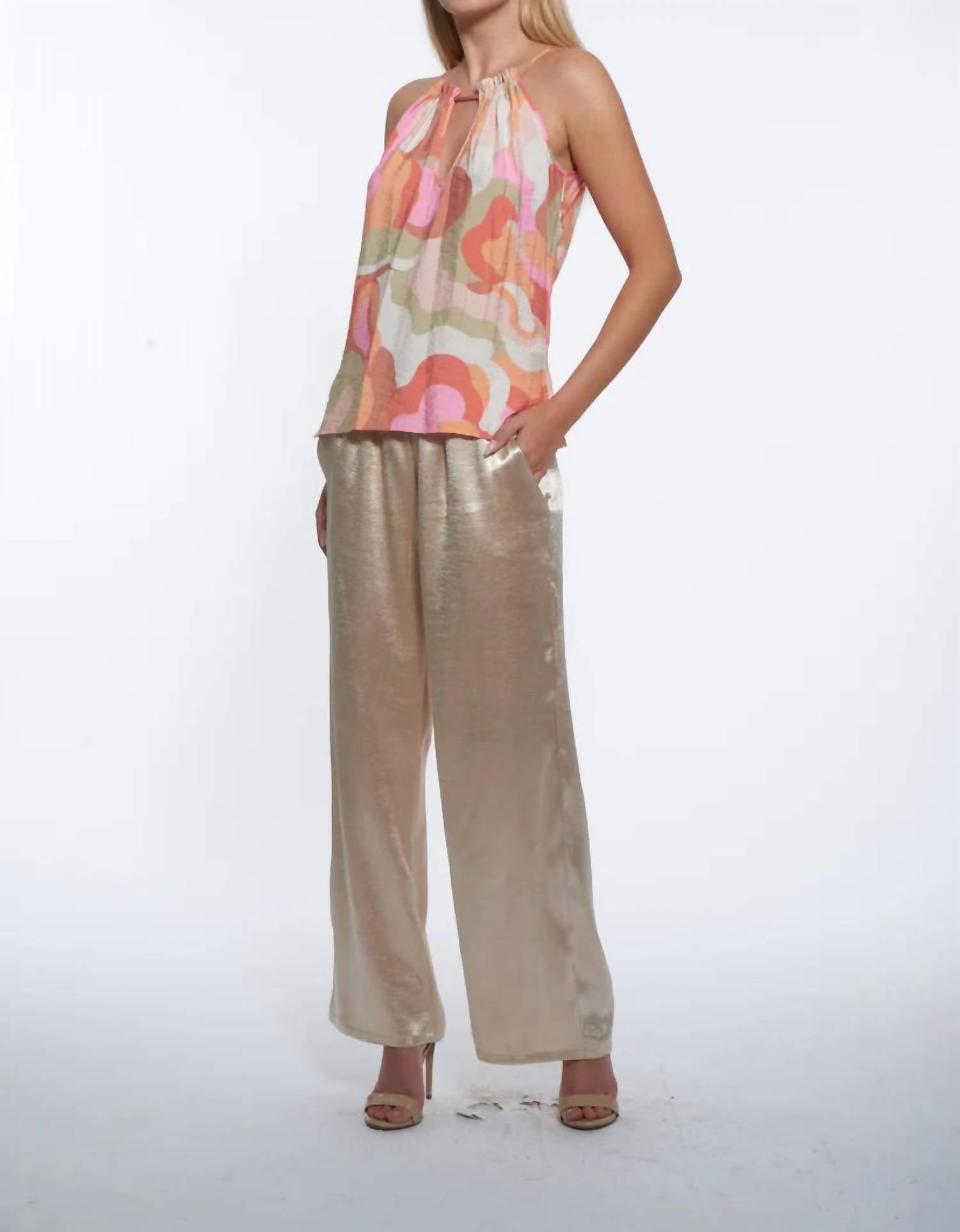 A timeless blouse that will never go out of style. Discover the Hall Halter Top by Julian Chang, an exquisite blouse in a vibrant Bloom floral pattern that captures playful charm with a touch of elegance. This women's top features delicate spaghetti straps and a scoopneck, highlighted by a halter neckline with a keyhole front detail. Made in the USA, it includes a tie closure for a flattering fit. Care instructions recommend hand washing with mild detergent and laying flat to dry to preserve the garment's shape and quality.