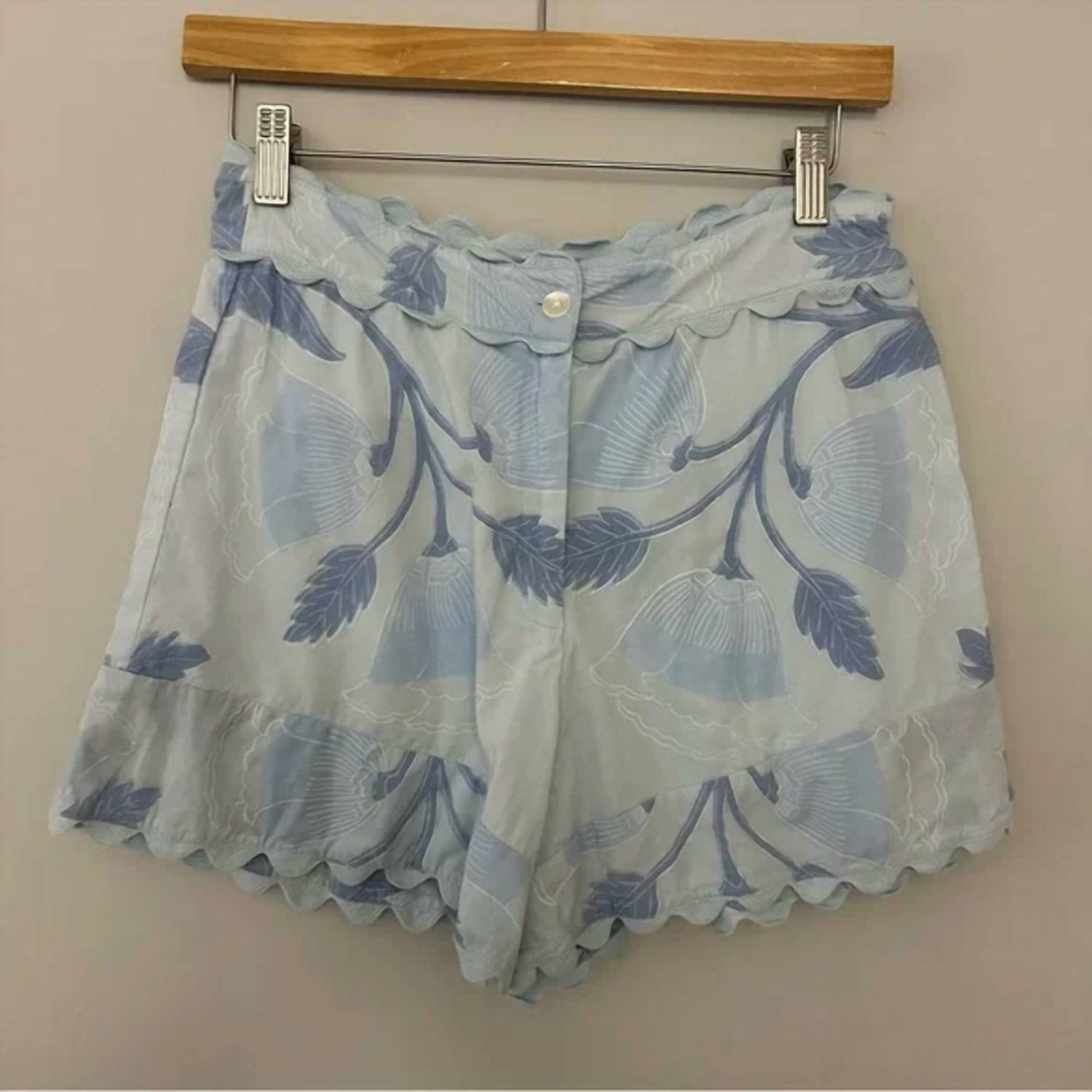 High-waist is here to stay and we especially love this style short. Elevate your summer wardrobe with the High Waist Bottoms by Juliet Dunn, a must-have for effortless vacation styling. Crafted from lightweight, breathable fabric, these pale blue trousers boast a stylish high-waisted fit and a zip closure. With its floral pattern, it's perfect for casual wear, beach outings, or embracing 90s fashion. Designed specifically for women, this piece complements any vacation ensemble.