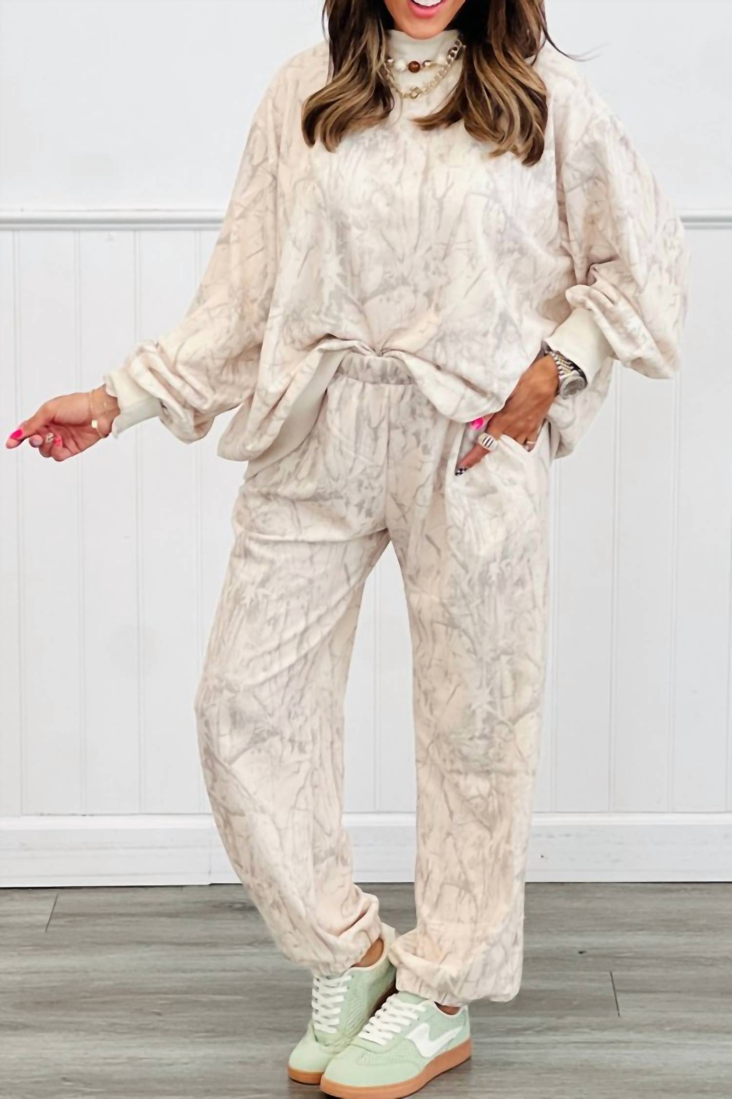 Loungewear doesn't have to be frumpy and this is exactly what we had in mind. Designed for a comfortable fit, this chic little number will be your favorite lounging-at-home look. Elevate your loungewear collection with the Cream Camo Pants Set by Jupiter & Me, perfect for a stylish yet comfortable streetwear look. This women's set features a patterned design in white and includes a long sleeve crewneck top, ideal for fall travel or Thanksgiving gatherings. Originating from an undefined location, this trendy ensemble is crafted to provide a cozy fit for any casual outing.
