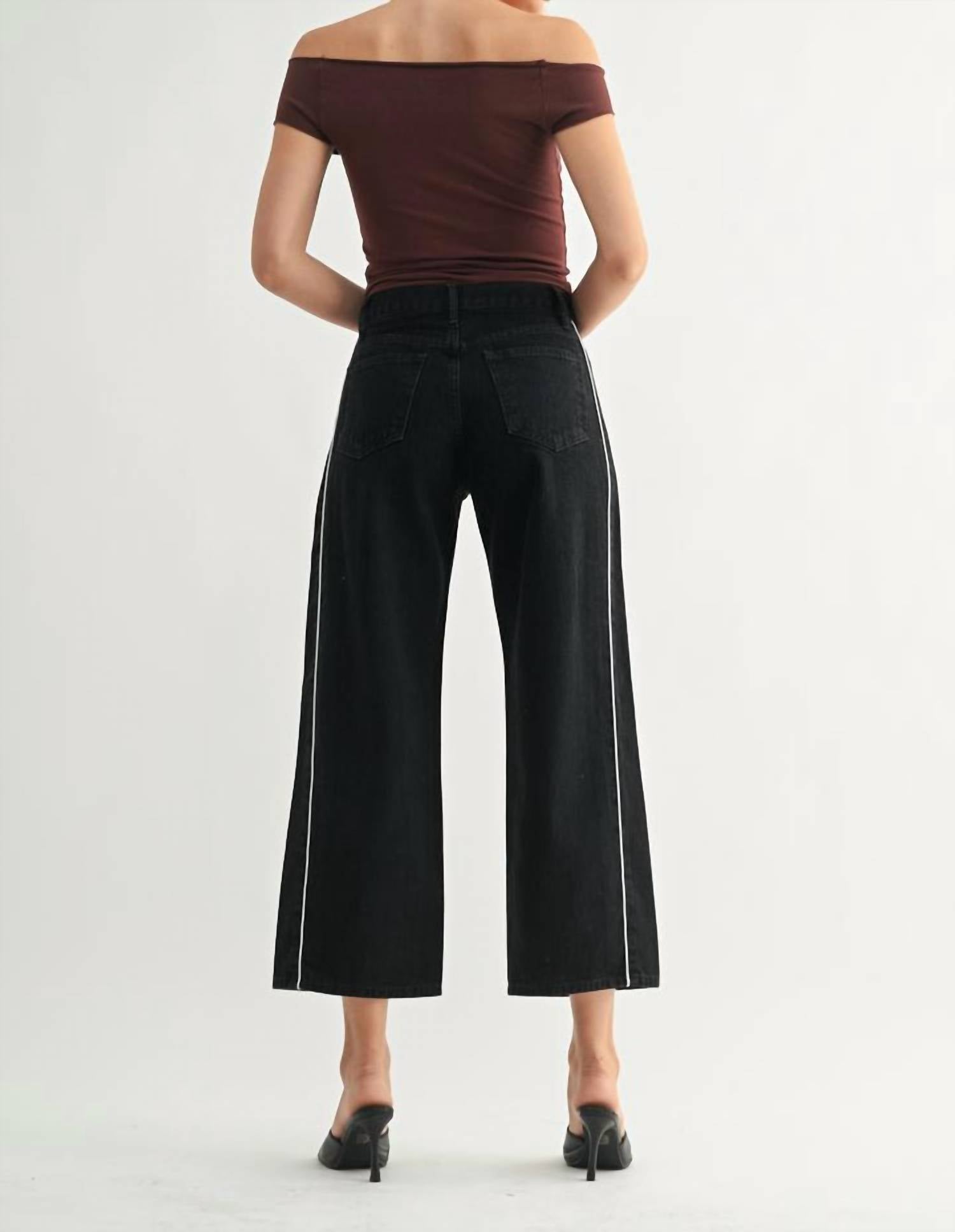 Pair these wide leg jeans with mules, slides or your favorite strappy sandals. Introducing the Barrel Twist Jeans by JUST BLACK DENIM, a chic addition to your wardrobe with a high-rise design and relaxed fit. These wide-leg jeans in classic black are crafted from 100% cotton non-stretch denim, providing a structured feel and flattering silhouette. Made in the USA, they feature a unique twist detail and a 12” rise with a 27” inseam. Closure: Button closure. Care: Machine wash cold, lay flat to dry. Model is wearing a size 26.