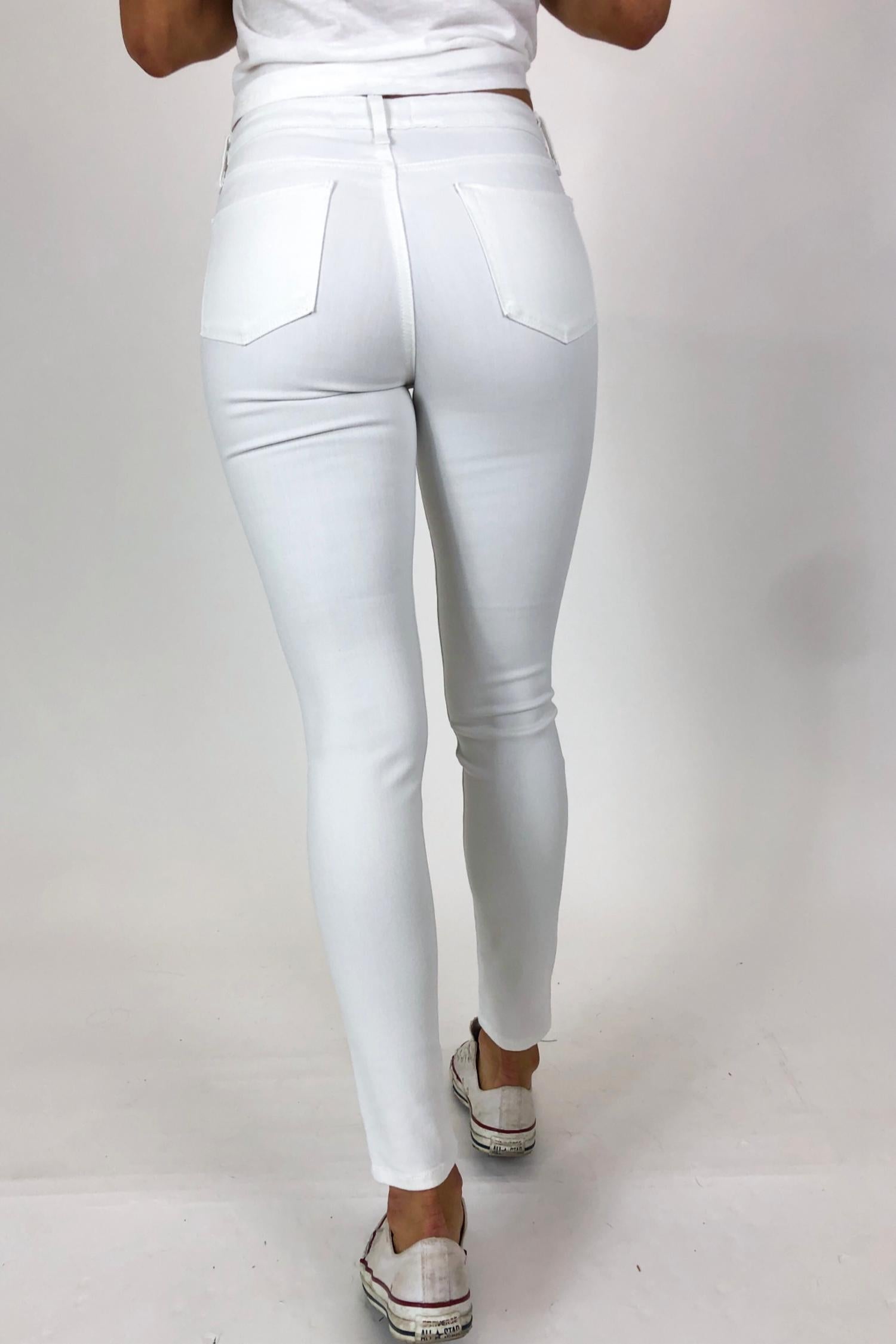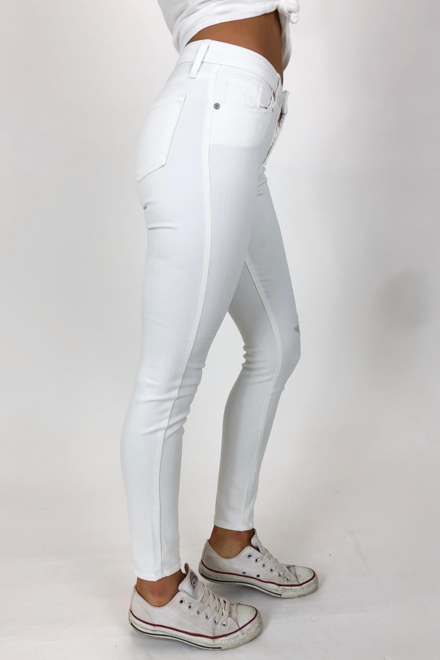 A skinny jean that is both flatering and comfortable. We love this style because it works great with boots, or without! Elevate your wardrobe with the Skinny Jean by JUST USA, crafted in a chic optic white for a minimalist look. These jeans offer a flattering slim fit with a mid-rise and skinny leg, perfect for versatile styling. Made from a soft and stretchy cotton blend, the fabric combines 52% Rayon, 26% Cotton, 21% Polyester, and 1% Spandex, featuring a distressed knee for added style. Closure: Button closure. The model is 5'8" and wears a size small, dress size 2.