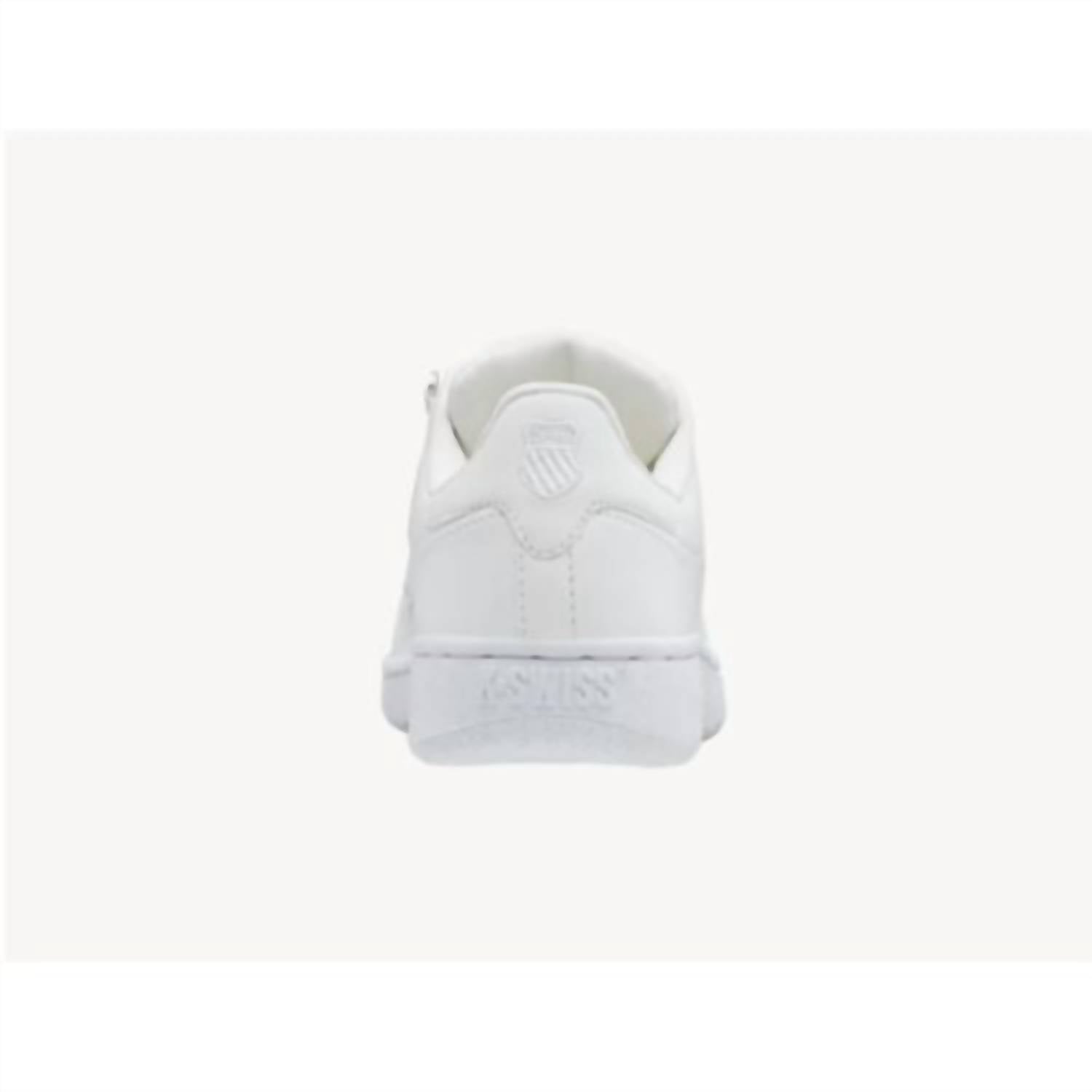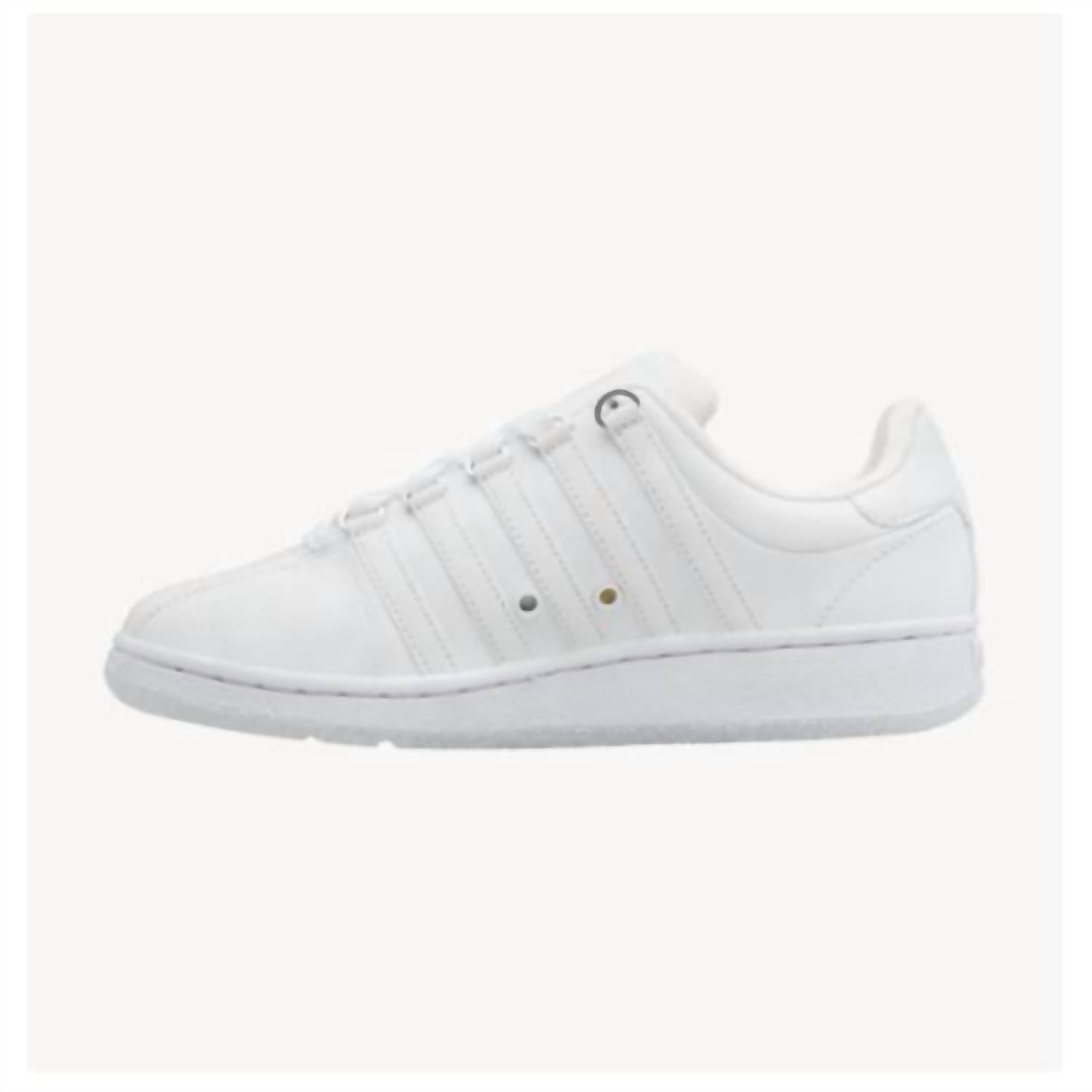 Introducing the Men's Classic Sneakers by K-Swiss, an ode to timeless style in sleek white. Crafted with a durable leather upper and enhanced with our iconic 5 stripes and a 3-piece toe, these shoes offer a modern twist on a classic design. The metal D-rings ensure secure lacing, while the molded EVA midsole provides superior comfort for all-day wear. Closure: Lace closure. Perfect for the modern man seeking both heritage and contemporary flair.
