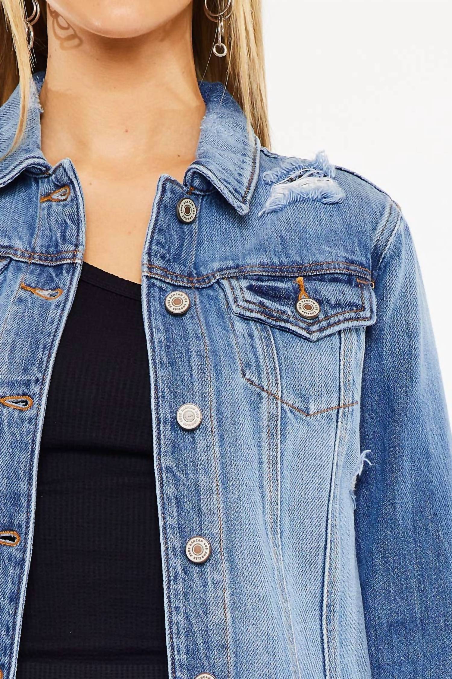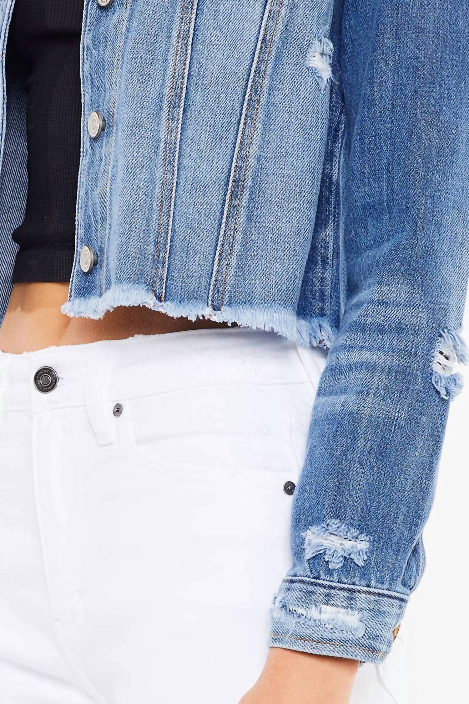Classic, cool and works with almost any outfit choice. Meet the Destructed Crop Denim Jacket from KanCan, a chic addition to your wardrobe in a medium wash ideal for streetwear style. With its long sleeves and detailed sleeve design, it features a classic collar and a convenient button closure. The jacket includes two button-flap pockets at the chest and is crafted entirely from soft, breathable cotton. Machine wash for easy care, making it a perfect travel companion for the spring season. Garment Length: 19.5 inches.