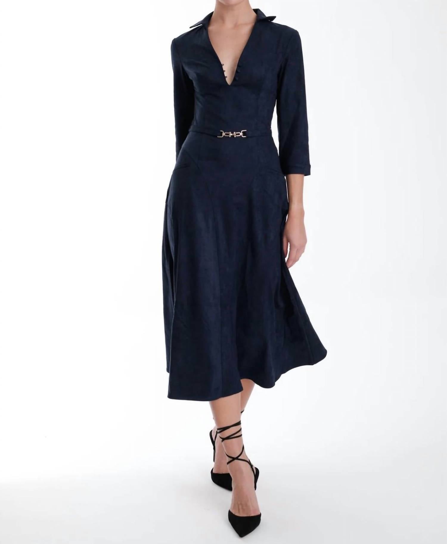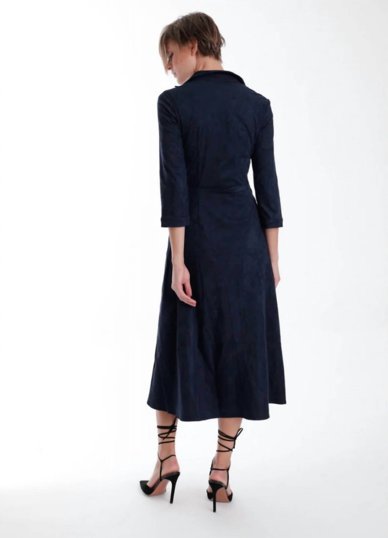 Pair with your favorite sandals for an effortlessly chic look. Experience the luxurious feel of the Victoria Suede Maxi Dress by Karina Grimaldi, elegantly designed with three-quarter sleeves for a sleek silhouette. This dress in a solid midnight hue offers a flattering V-neckline and shirt dress silhouette. Its pull-on closure ensures ease of wear, perfect for evening events. While care instructions are not specified, this dress is an ideal choice for fall and resonates well with 90s fashion trends.