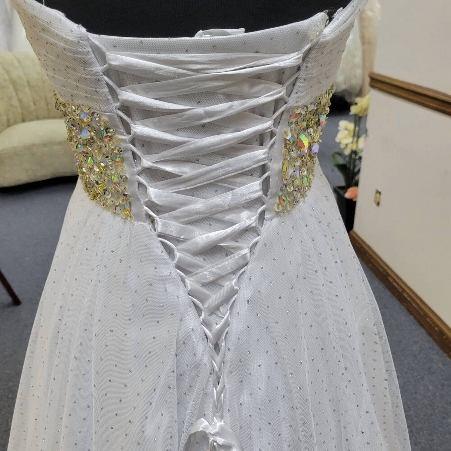 Style this maxi with your favorite statement necklace and sandals for the perfect look. Make a statement at your next event with the Women's Ball Gown Maxi Dress by Karishma Creations in an elegant white and silver hue. This strapless dress features a textured A-line silhouette with a sophisticated off-the-shoulder neckline, perfect for a wedding occasion. Closure is secured with a tie, providing a seamless fit. Emphasizing a trend of quiet luxury, this maxi dress embodies timeless spring style.