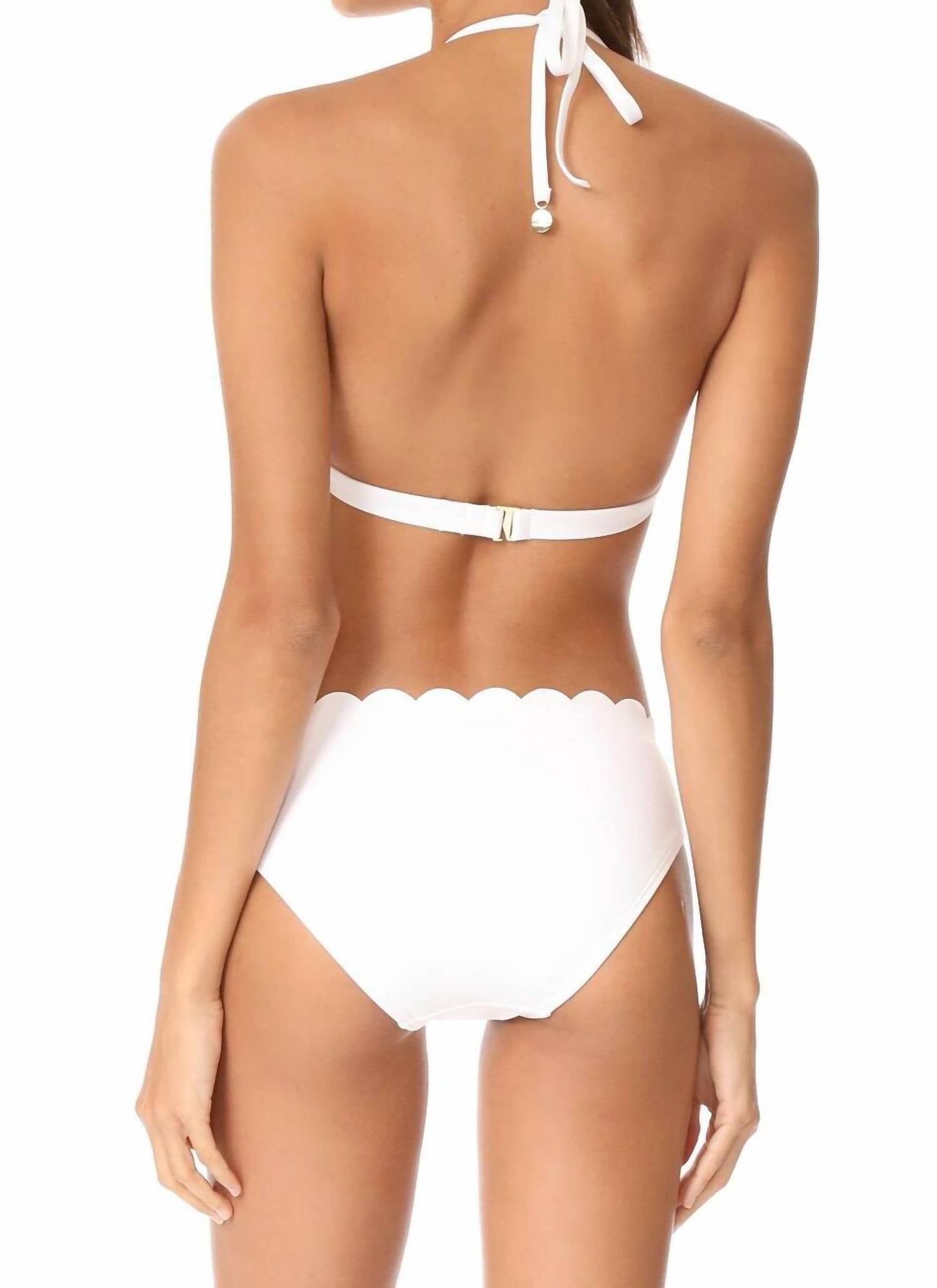This cute and flattering swimsuit is perfect for making a splash at the pool, lounging on sun-kissed beaches, and staying stylish throughout the upcoming summer season. Add a dash of elegance to your beach day with the Scalloped Triangle Bikini Top by Kate Spade, crafted in a timeless white hue. This solid-patterned swim top offers cheeky coverage perfect for a stylish summer escape. It features a chic triangle style with delicate scalloped edges for a touch of modern flair. Pair it with your favorite bikini bottoms for a coordinated and sophisticated swimwear ensemble.