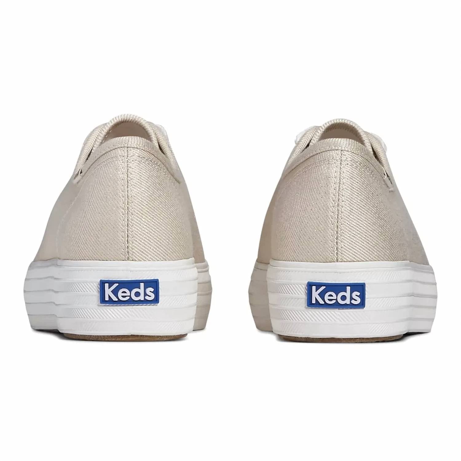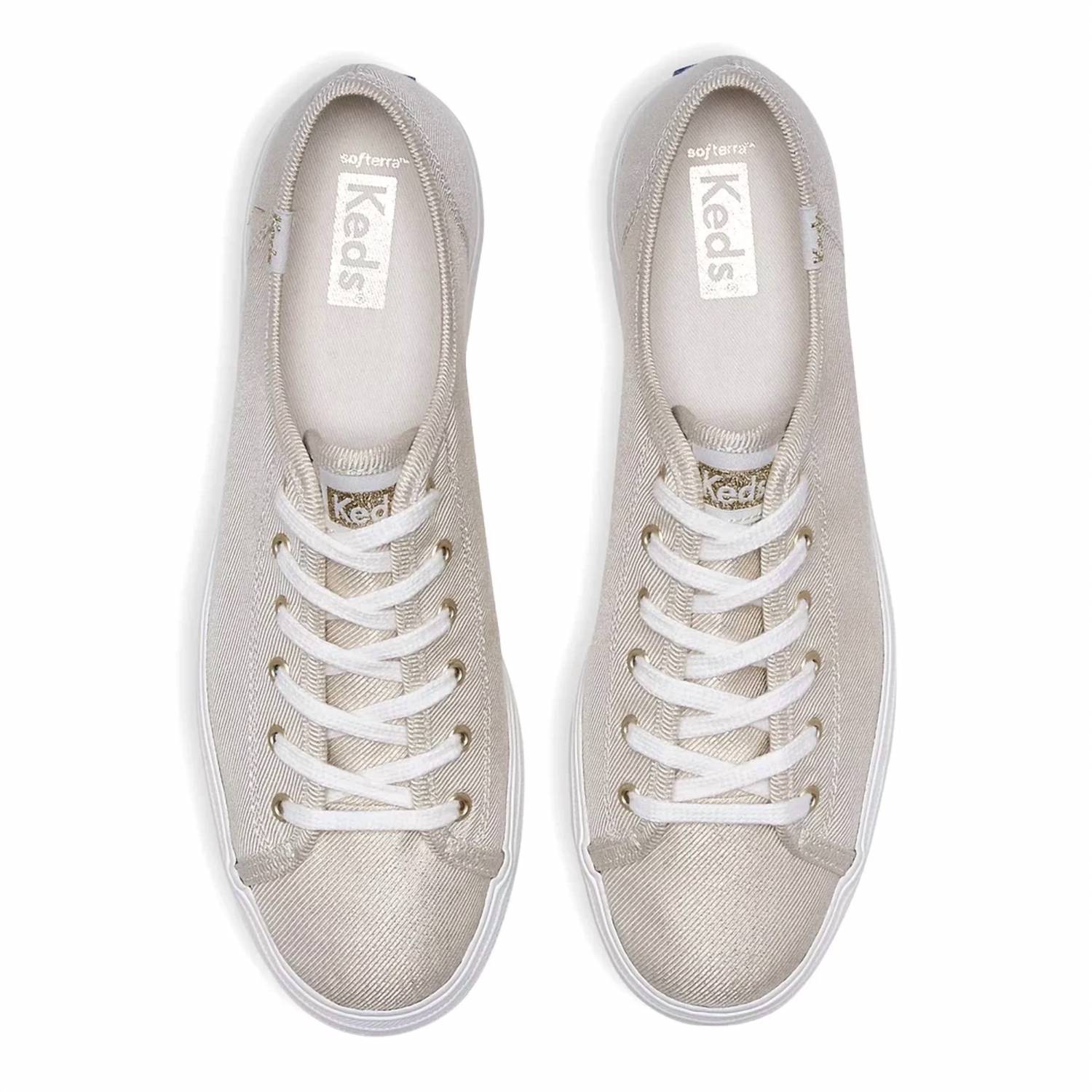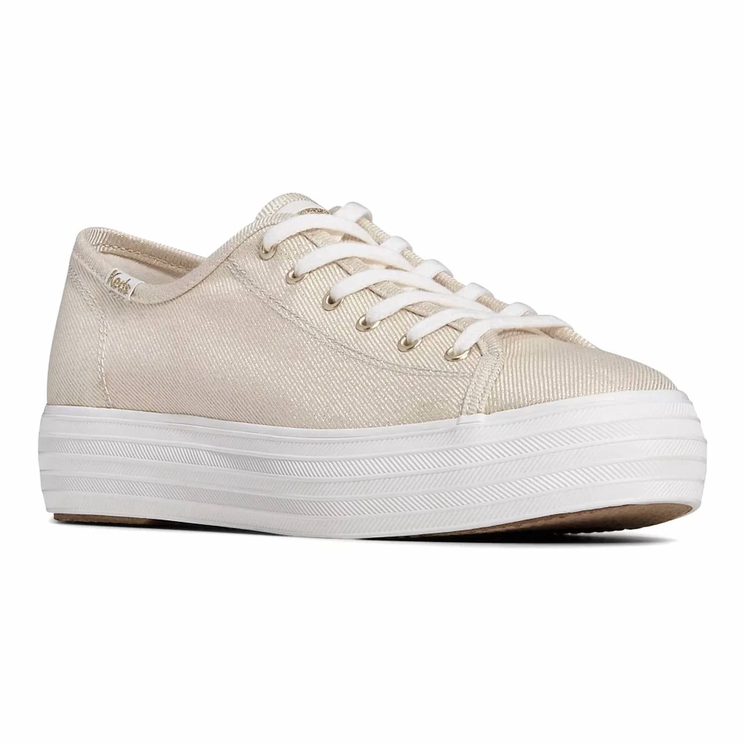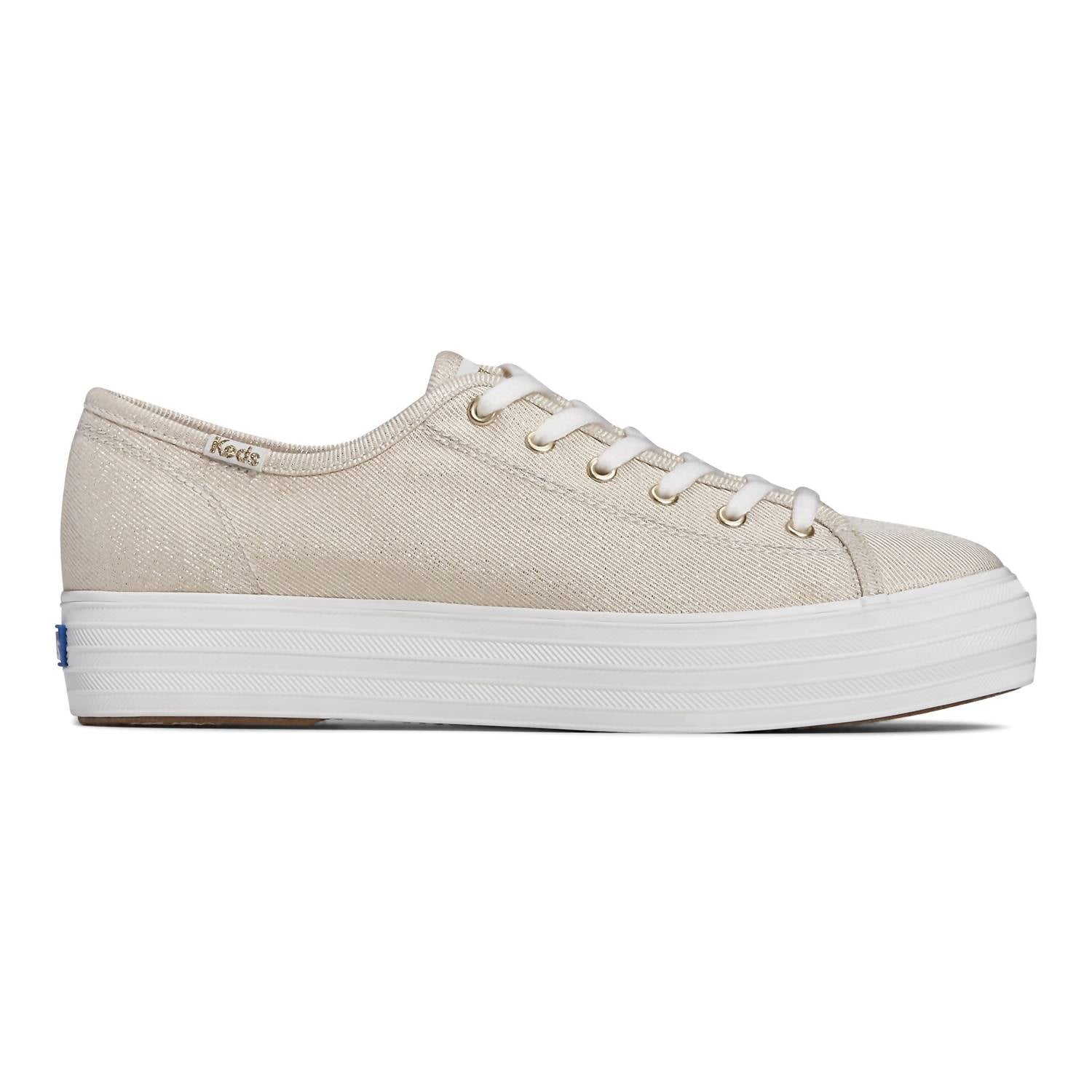 When fashion and function come together seamlessly. Step up your style game with the Women's Triple Kick Metallic Shoes by Keds, a perfect blend of comfort and chic design. This gold sneaker features a metallic textile upper and a lace-up platform for adjustable width, while the 1” platform bottoms provide an elevated silhouette. Imported and crafted with a soft, breathable canvas lining and a 10% recycled PU Foam Softerra™ footbed, these shoes are designed for both comfort and sustainability. Care: Spot wash, air dry for easy maintenance.