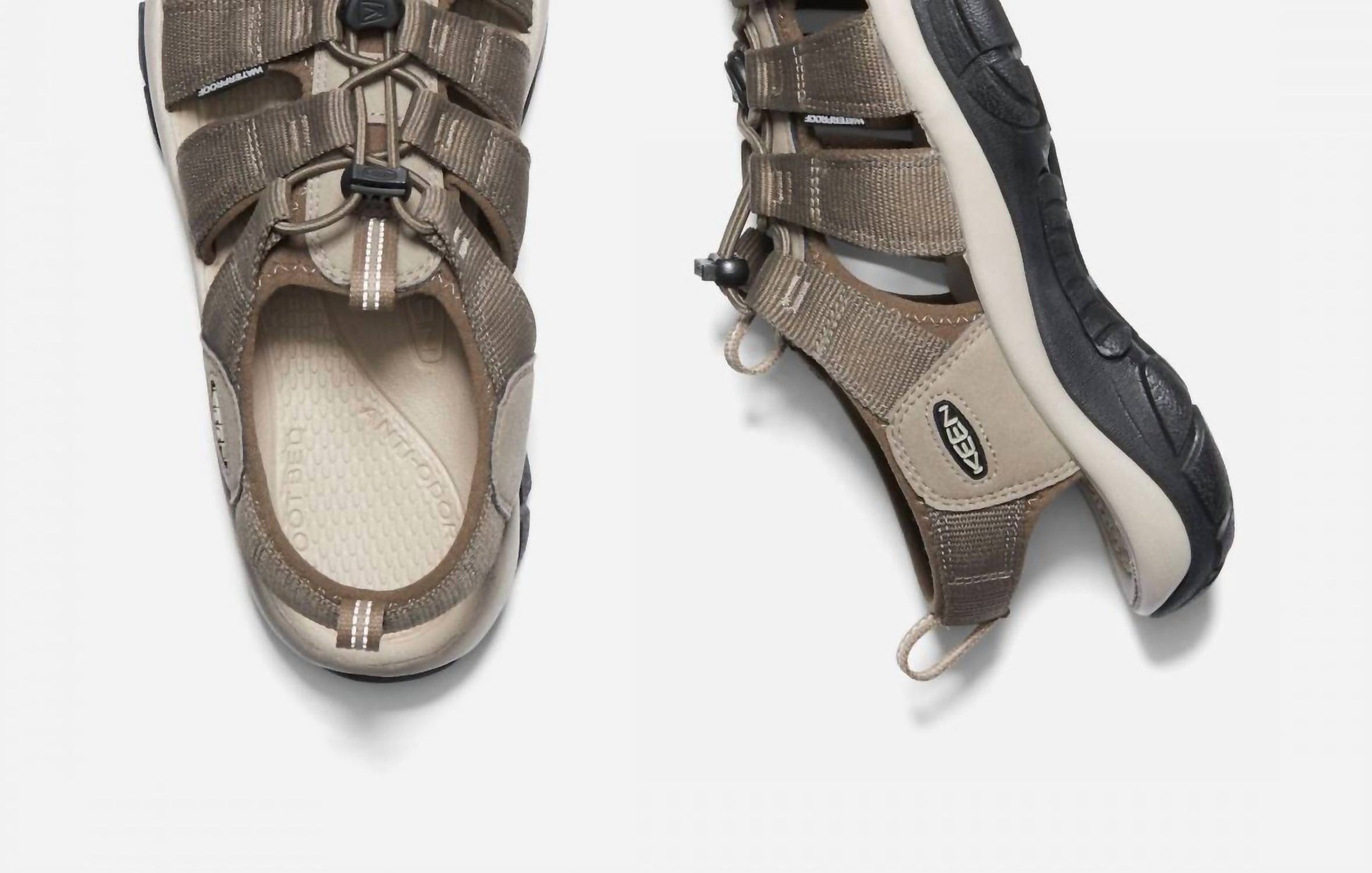 Step into adventure with the Men's Newport H2 Sandal by Keen, designed for comfort and traction in brindle/canteen. Featuring a quick-cinch bungee lacing system for easy on and off, and an original fit that provides generous space for toes to splay. The sandal boasts a foam midsole, shock-absorbing foam insole with arch support, and a higher-traction rubber outsole with multi-directional lug pattern for superior grip on wet surfaces. Crafted from washable polyester webbing, this flat-heeled sandal with a 1.1-inch height is perfect for summer hiking.