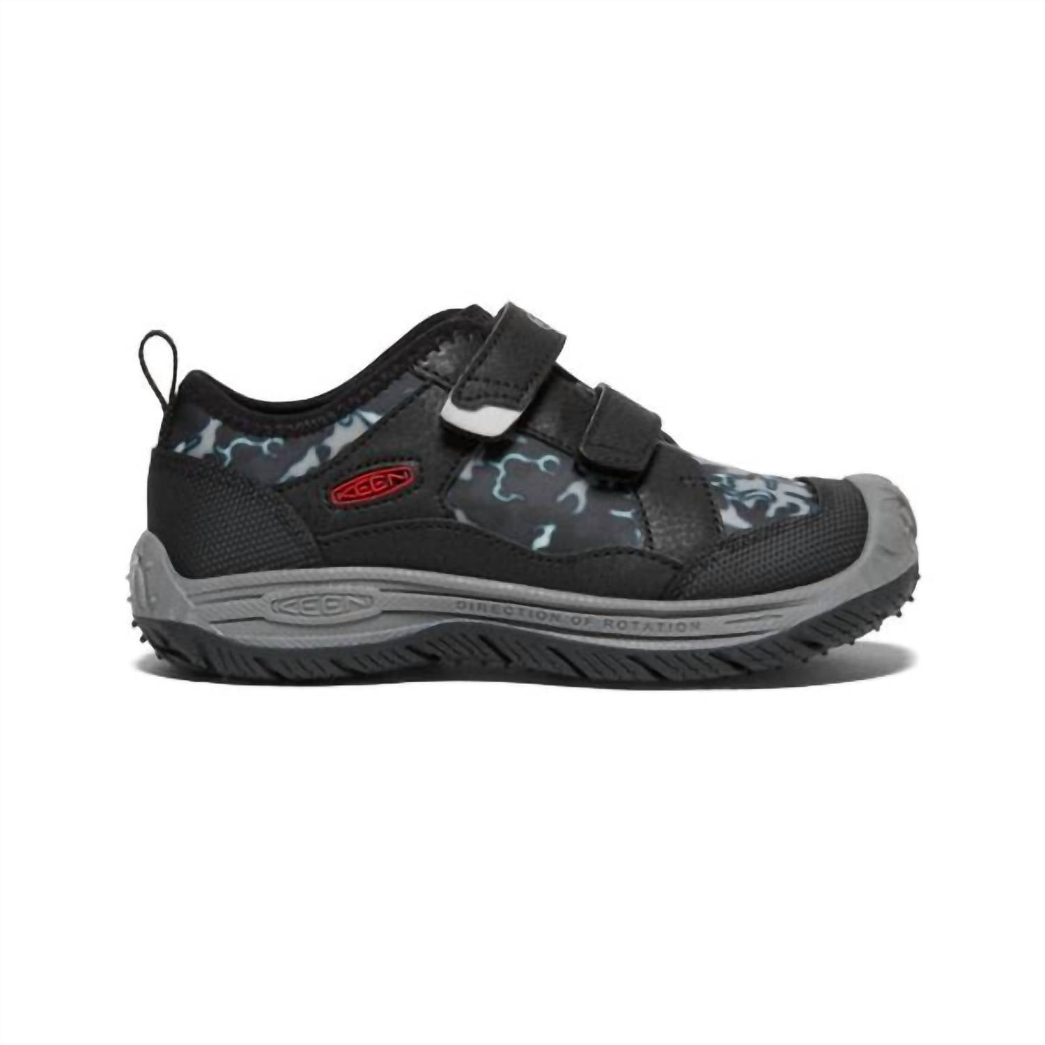 Toddler's Speed Hound Shoes by Keen, designed for the little ones with a combination of black and camo for that streetwear edge. These sneakers feature a round toe and flat heel, perfect for spring and ideal for vacations. The flat heel ensures comfort throughout the day. Let your toddler explore with a touch of trendiness and practicality.