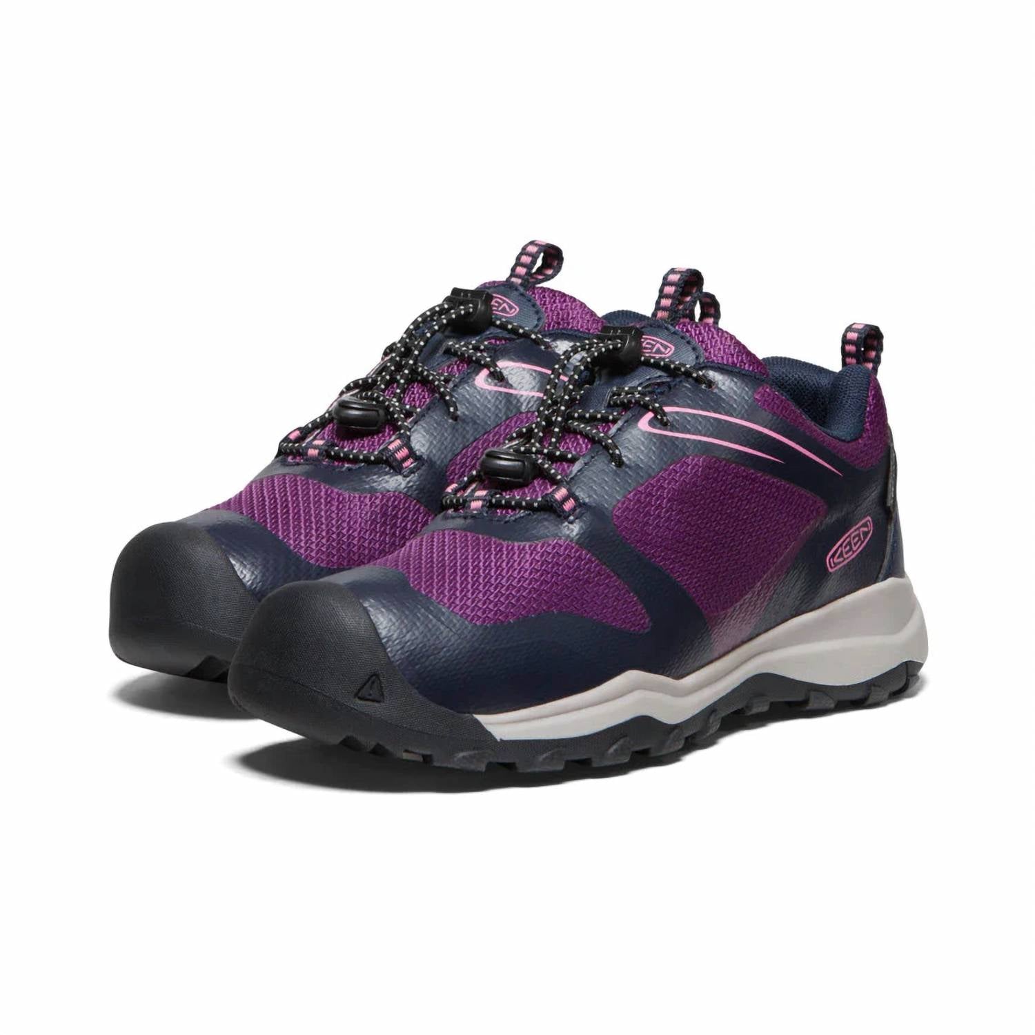Presenting the Youth Wanduro Low Waterproof Shoes by Keen, expertly designed for adventurous teens ready to tackle the outdoors. With a contoured fit and round toe, this unisex sneaker offers a padded tongue and collar for enhanced comfort. Featuring a waterproof synthetic and textile upper, quick-cinch bungee lacing, and breathable mesh lining, these sneakers provide both security and ease. The resilient foam insole with arch support, along with an engineered rubber outsole, ensures durability and traction, perfect for fall hiking.