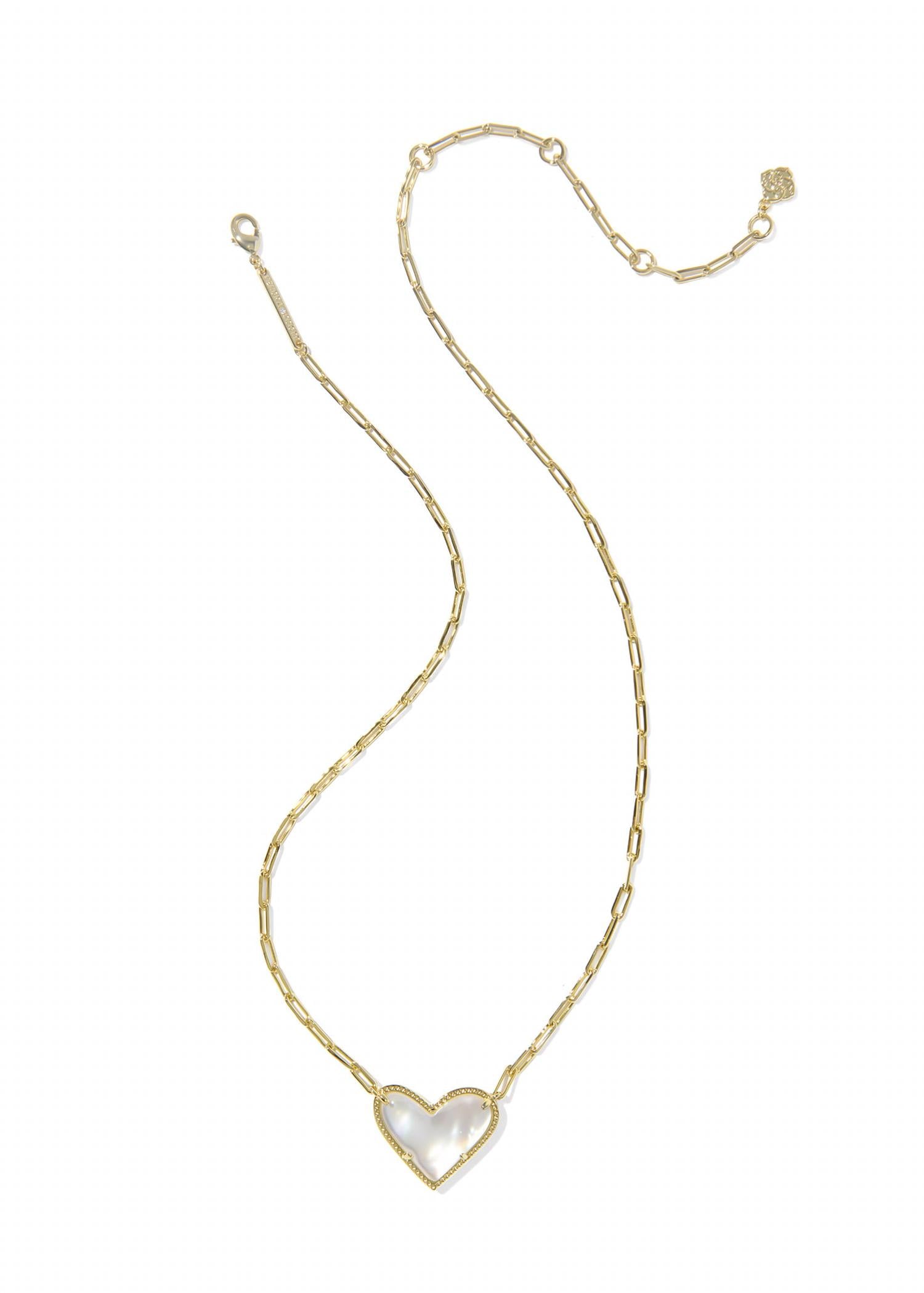 Layer this necklace or wear it on its own. Either way it's a win-win. Celebrate romance with the Women's Ari Heart Statement Short Pendant Necklace by Kendra Scott. This necklace in Gold/Ivory Mother of Pearl flaunts a maximalist heart shape on a trendy paperclip chain. Crafted from gold plating, it adds a sweet touch to any outfit. Closure: Lobster clasp for easy wear.