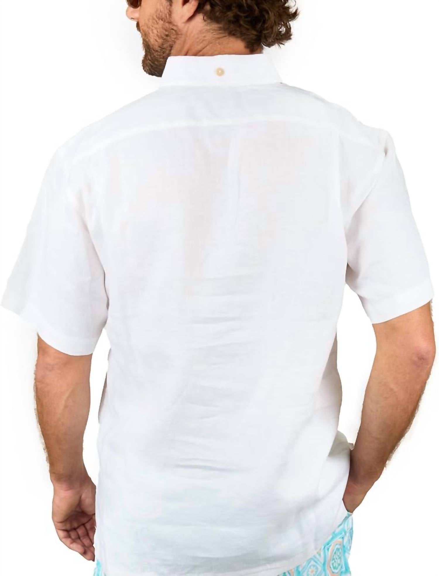 Introducing the Casa Blanca Short Sleeve Linen Shirt by Kenny Flowers, an ideal choice for your summer wardrobe. This minimalist piece comes in a crisp white shade, crafted from 100% linen and features short sleeves. It is designed with a unique Coconuttons™ closure, a Sunglass Loop™, and double-stitched detail for added style. Made in Bali, this shirt is best maintained with hand washing and line drying.