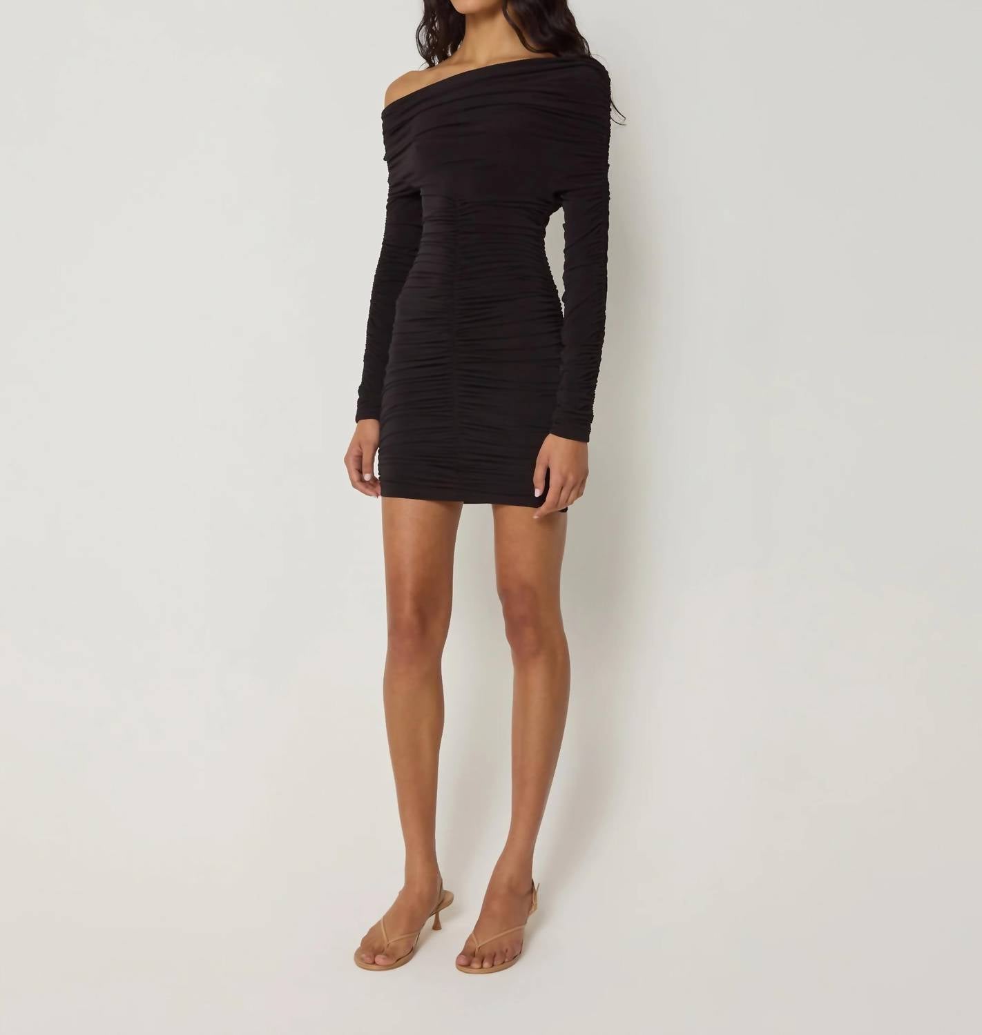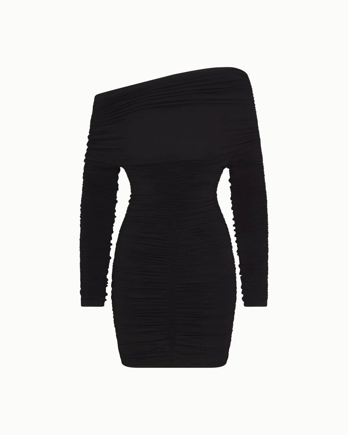 A short and breezy dress for those warmer days. Introducing the Off Shoulder Ruched Dress by KHY, an elegant choice for your next evening event. This mini dress features long sleeves and a versatile off-the-shoulder neckline, crafted from a matte stretch jersey comprised of 96% Polyester and 4% Elastane. Boasting an artful ruched detailing throughout and a bodycon silhouette, it creates a flattering draping effect. Made in China with a pull-on closure, this minimalist black dress measures 27 inches in length.