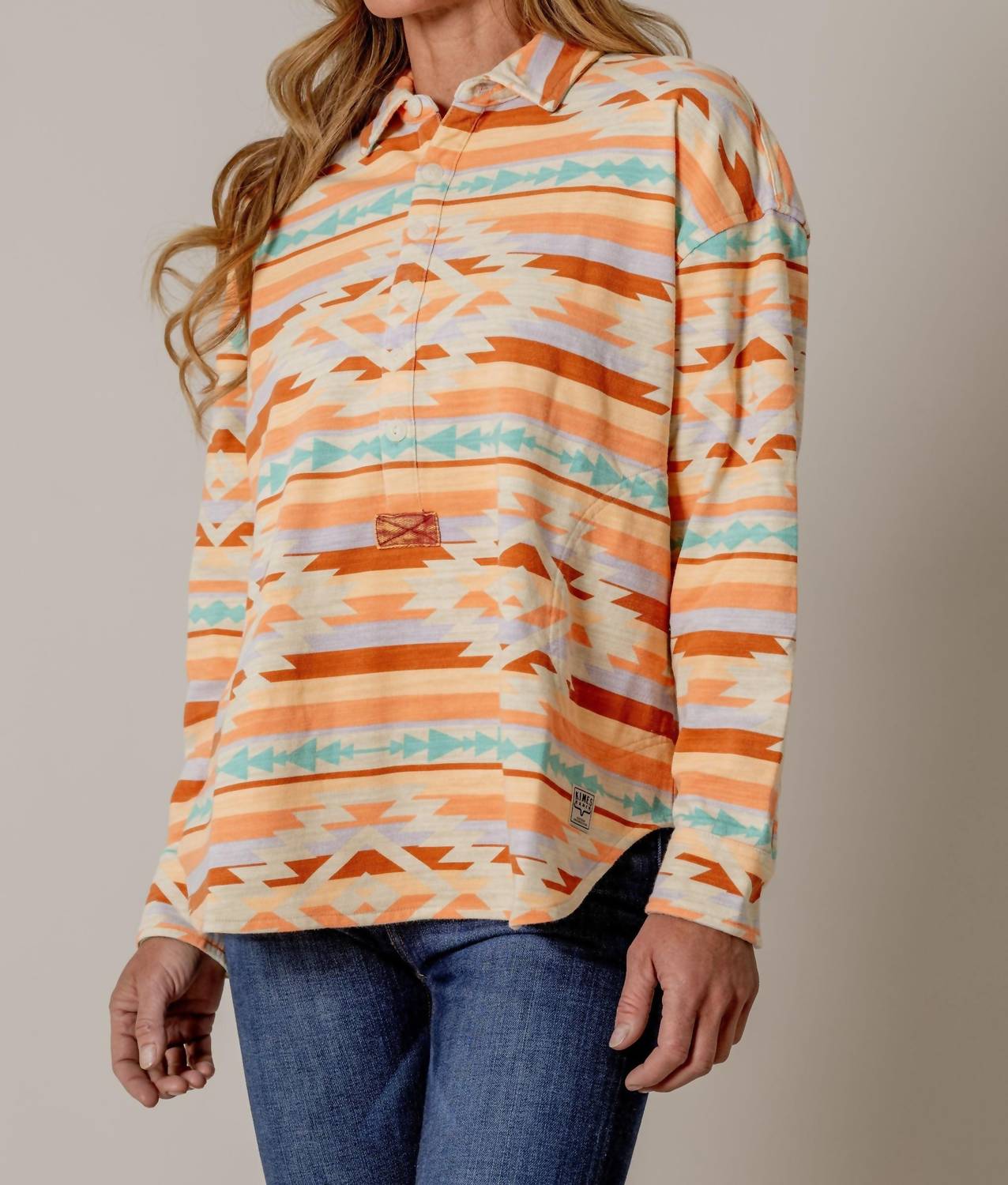 The ultimate go-to sweater, expertly crafted to provide the perfect combination of warmth and style. Its classic design and soft fabric make it a must-have addition to your wardrobe. Introducing the Women's Judith Top by Kimes Ranch, a long sleeve piece crafted from a soft terry material featuring a southwestern stripe pattern in vibrant orange. Made from 85% Cotton and 15% Polyester, this top boasts a long body with practical side pockets for added convenience. The stylish button front closure and collar neckline enhance its versatility, ideal for fall vacations and maximalist trends.