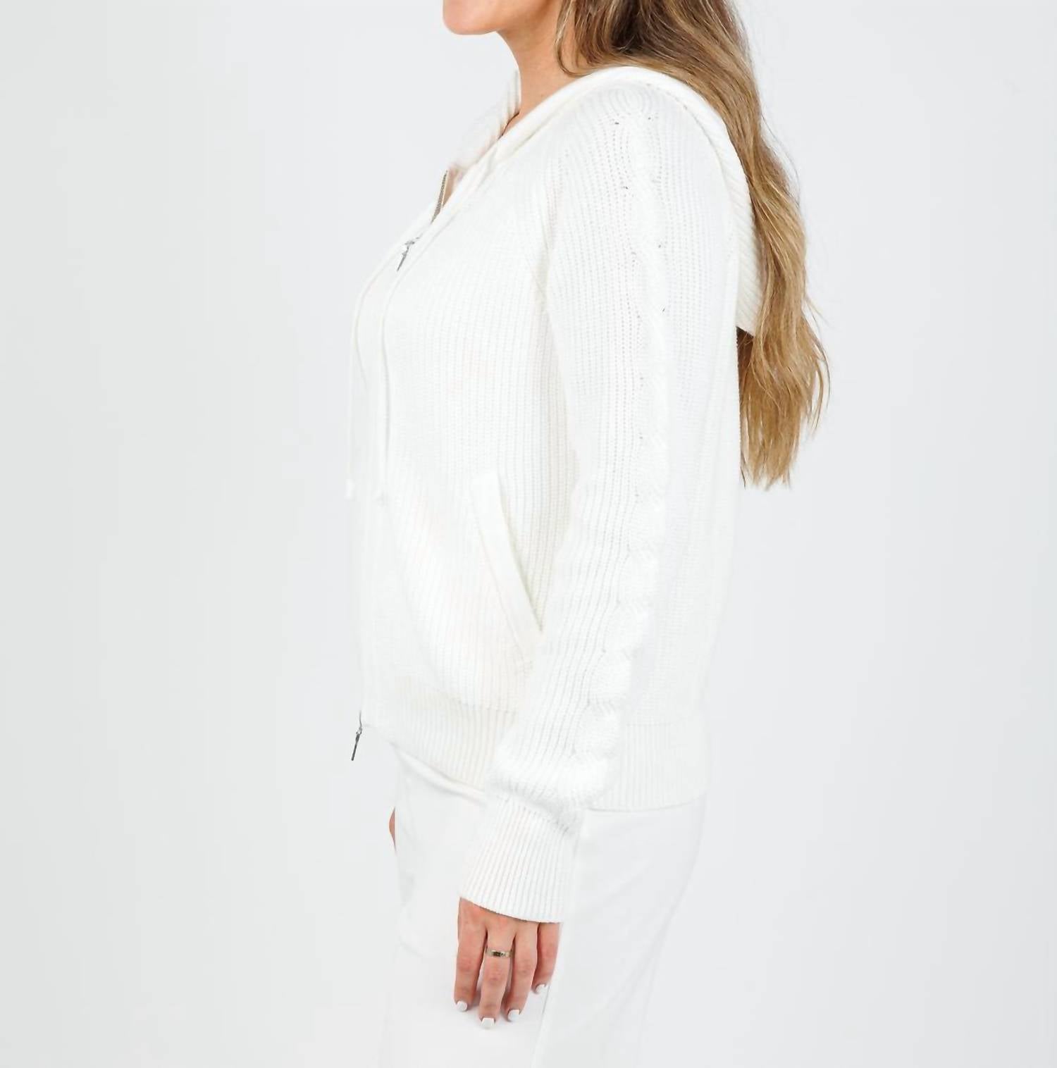 Cooler temps call for layering and we love this adorable sweatshirt for all the obvious reasons. Discover the Kinross Claire Cable & Rib Zip Hoodie in a sophisticated cream hue, offering a chic take on everyday comfort. This cotton-crafted hoodie features long sleeves with a delicate cable design, a convenient zip front closure, and a hood with a drawstring for adjustable coverage. Details like front pockets add practicality, making it a perfect blend of sports-inspired style and classic texture. Care is easy with machine wash instructions, ensuring you can enjoy this versatile piece season after season. Model is wearing a size S, standing at 5'6" with a 34" bust, 28.5" waist, and 31" hip.