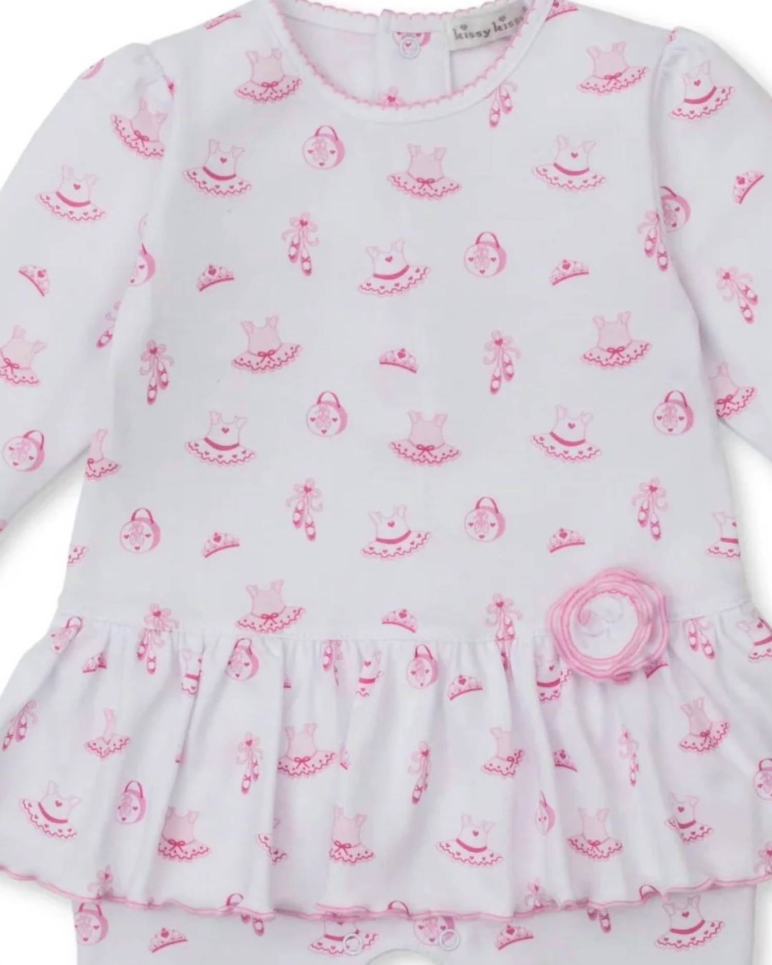 Introducing the Girls' Ready To Dance Playsuit by Kissy Kissy, crafted with soft breathable fabric that is gentle on delicate skin. This white playsuit features a timeless pattern and a pull-on closure for easy changes, making it a practical choice for everyday wear. Designed for newborns and infants, it offers comfort and freedom of movement, ideal for activities like play and rest. Care instructions include machine washing on cold and tumbling dry on low, making it perfect for busy parents.