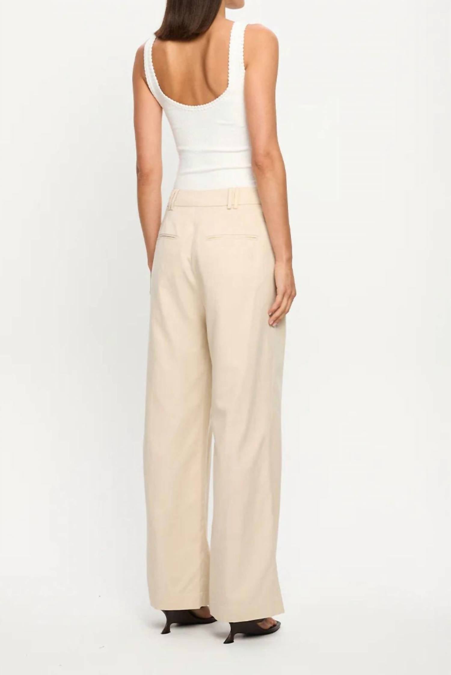 No gym necessary for these cool-girl joggers. Discover the KIVARI Hazel Pant in Cream, where comfort meets elegance. These pants, crafted from a 55% Lyocell and 45% Cotton blend, offer a high-rise and relaxed, wide-leg silhouette. Details include a pleat front and back jett pockets with a tailored zip fly and hook and bar closure. Perfect for a minimalist spring style, these pants fit true to size and feature twin belt loops for added versatility. Studio model is wearing a size 8 and stands 178cm tall.